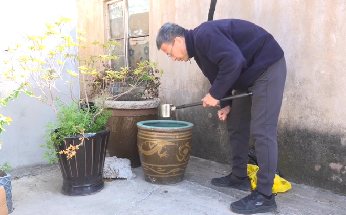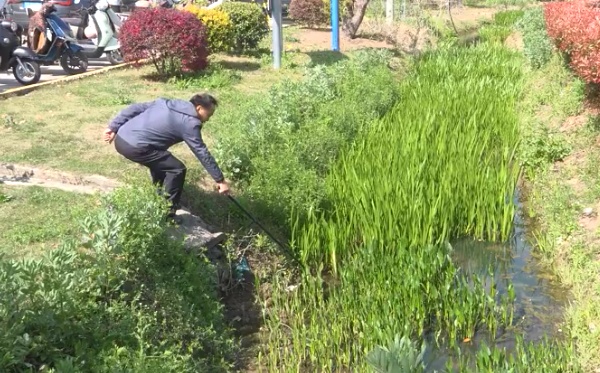 除了监测成蚊,疾控工作人员还对积水处的蚊幼虫进行监测。在居民区附近一处闲置空地的小水缸旁,工作人员手持长柄采样勺舀取水体,发现了一个虫卵。对公共小河流,同样采用了“采样勺法”观察水中幼虫,为后续精准消杀提供了依据。
