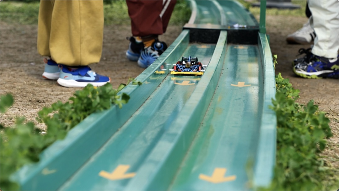 为了真正做到适配所有人,团队前后打磨调试了三个版本。第一版过于简单,资深玩家觉得“不过瘾”;第二版过于专业,弯道急、坡度陡,孩子和新手难以驾驭。最终版结合郊野公园原有的田园地形,反复优化赛道坡度与弯道比例,兼顾专业性、趣味性与安全性。