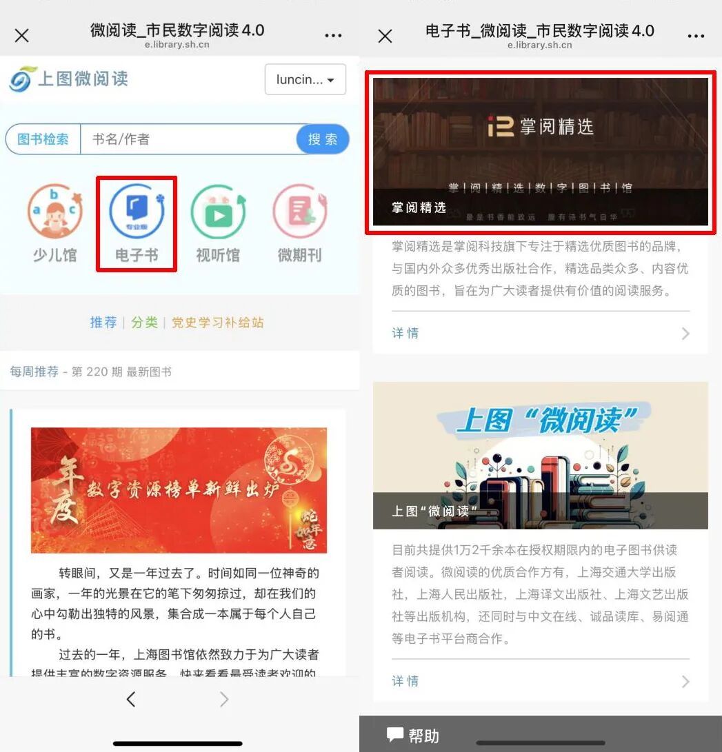 登录【微阅读】平台后,点击【电子书】图标,找到【掌阅精选】,点击图片即可进入书城。
