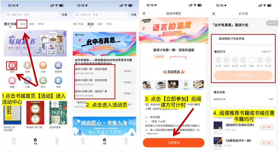 阅读推荐书单或掌阅精选书城内任意电子书,每日阅读满20分钟即可(速读模式、AI朗读、自动翻页、听书均不计入活动时长)。