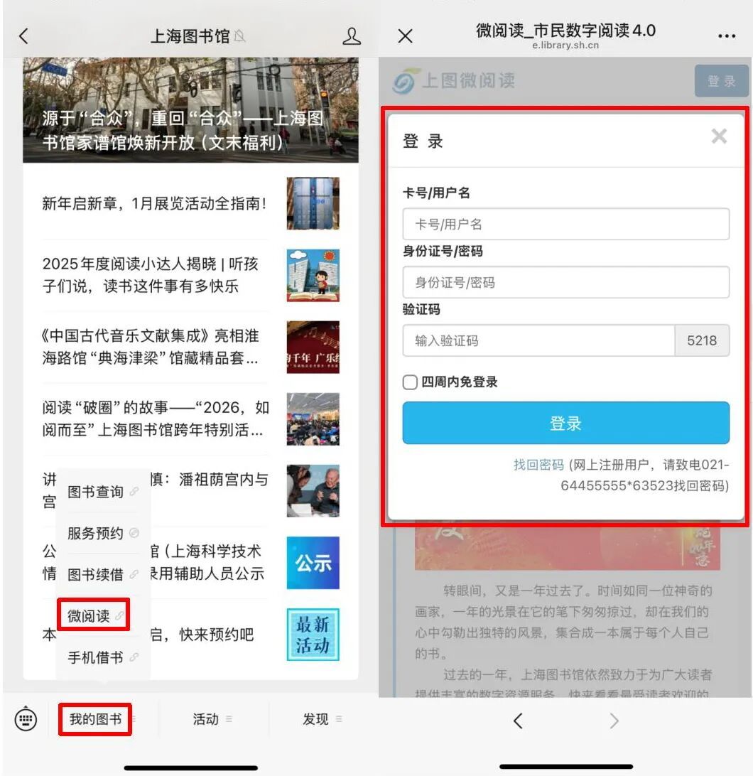 进入“上海图书馆”公众号,点击左下角【我的图书】-【微阅读】;首次访问的读者,依次输入用户名(或者读者证号)和密码(活身份证号)登录微阅读。后续访问无需再次登录。