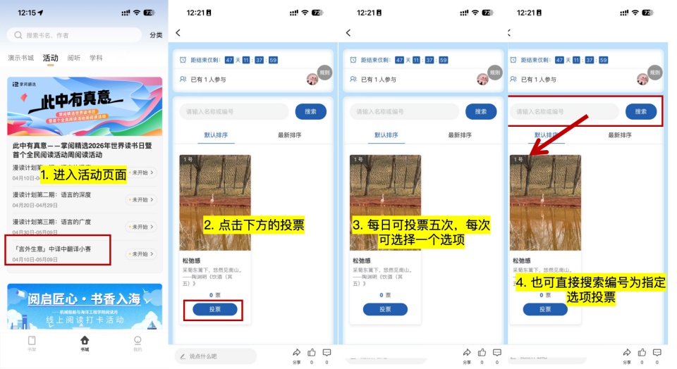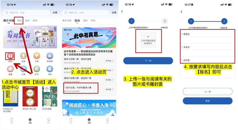 活动期间每人可参与一次,提交 【原表达】 和 【翻译版】,翻译字数建议在50-200字,并上传一张书籍封面图或与阅读有关的图片。