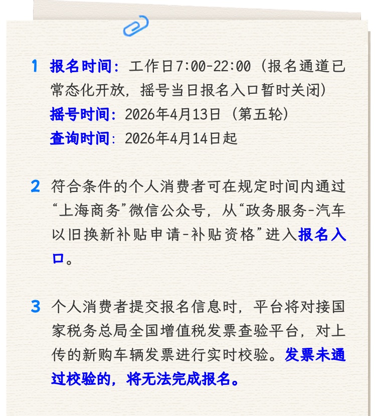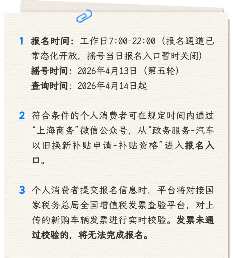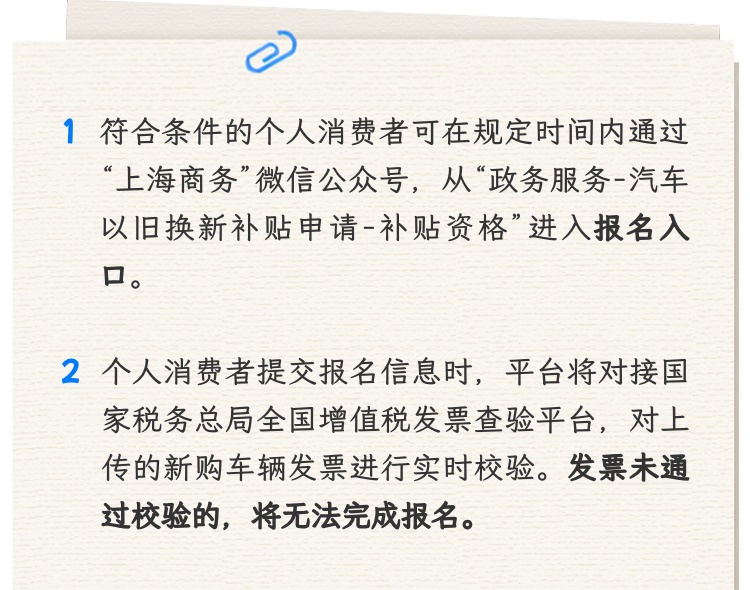 符合条件的个人消费者可在规定时间内通过“上海商务”微信公众号,从“政务服务—汽车以旧换新补贴申请—补贴资格”进入报名入口。个人消费者报名时需填报并授权平台使用相关个人信息,包括姓名、手机号码、身份证件号码、旧车车牌号、新购车辆发票等信息。