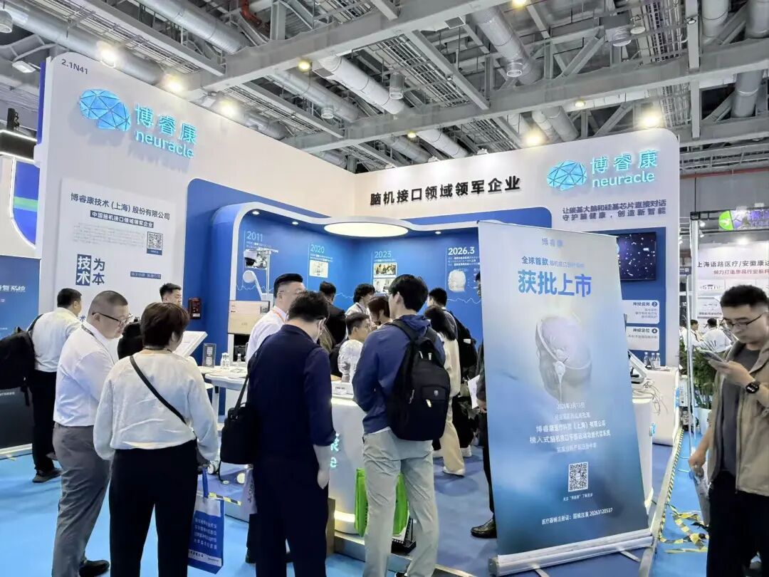 位于2.1馆的博睿康公司展台虽然面积不大,但人流密集度高。在展台现场,“全球首款脑机接口医疗器械获批上市”的海报被摆在最醒目的位置。