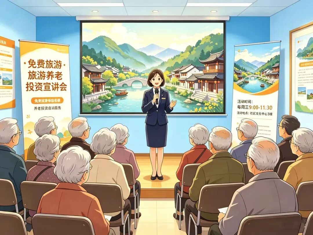 注意以“分时度假会员”“旅游养老投资”“旅游+金融”等为名的新型骗局,承诺“免费旅游+年化收益”的旅游产品,尤其警惕针对老年人组织“健康讲座+免费旅游”“产品推介会”等名义的旅游活动。