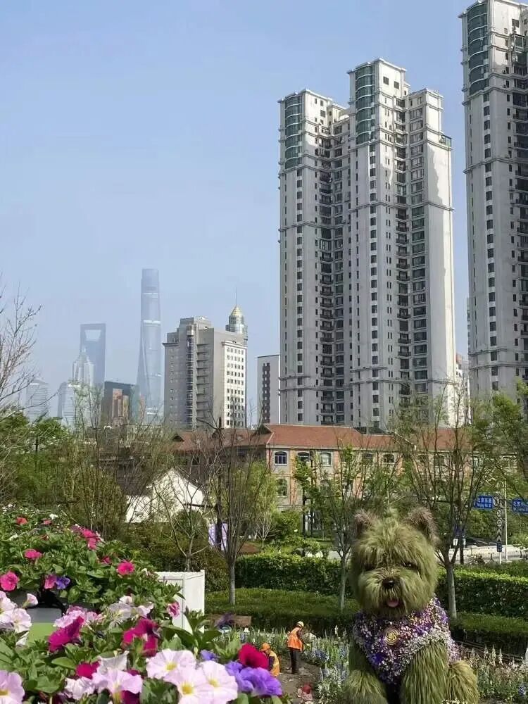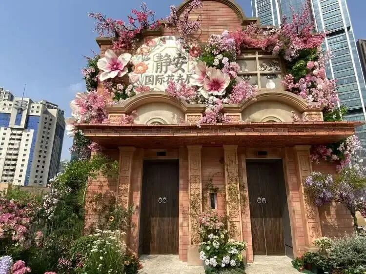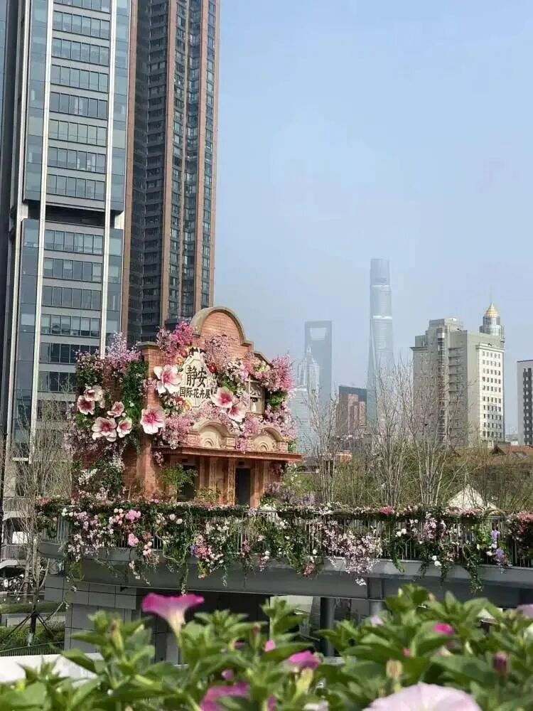 在“小狗”旁边的天桥上,是静安国际花卉展的另一个景点“繁花里·空中石库门”。