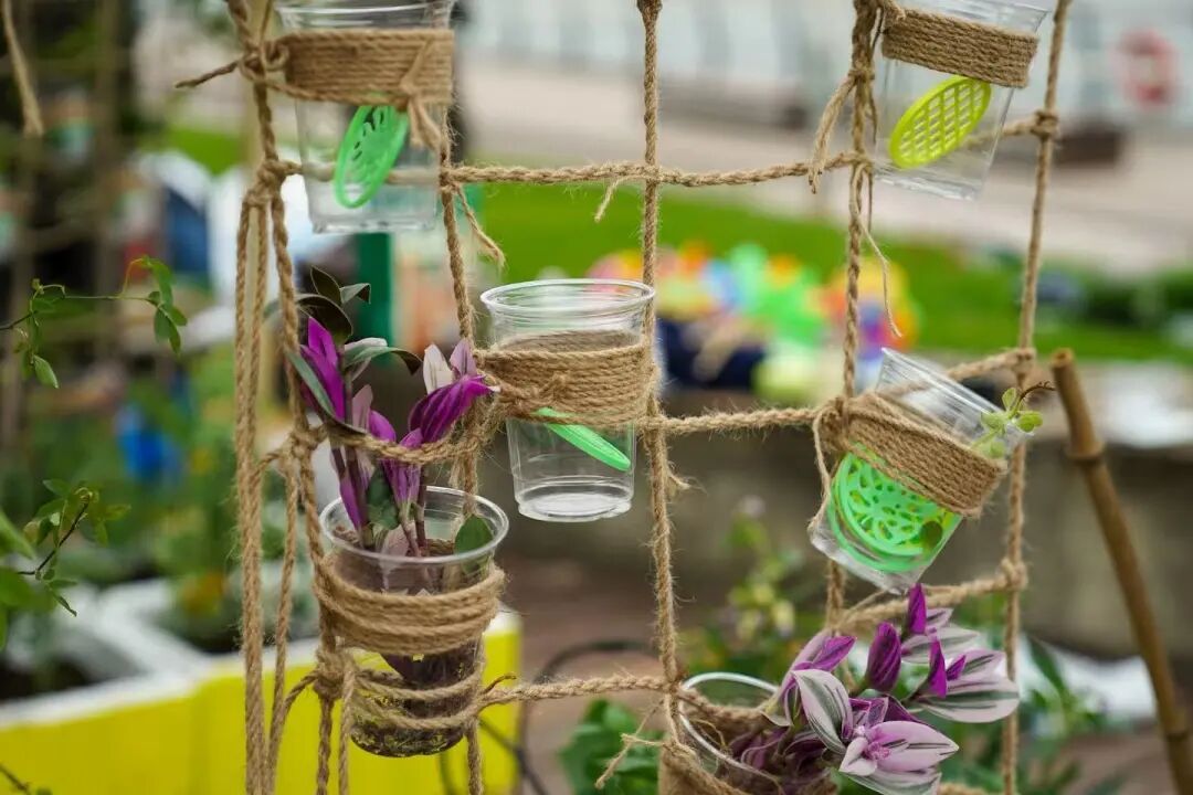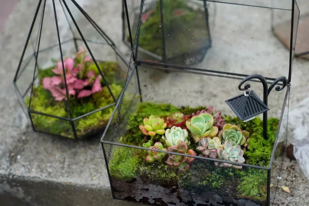 其余共创作品同样各具巧思,主题丰富多元。“康养疗愈阳台”将东方“药食同源”智慧融入旧物改造,营造都市微型生态岛;“AI共生花园”探索以科技赋能自然,构建智慧循环的未来图景;“拾光疗愈花园”融合视觉、听觉、嗅觉等五感设计,打造沉浸式诗意疗愈空间;“野趣花镜”则通过重构迷你森林,营造高级静谧的原始生境氛围。还有来自校园的青春力量,创作了名为“致青春”的微景观系列。设计者表示,时值五六月的毕业季,他们希望将毕业主题与花展结合,于是用文心兰、虎耳草、多肉、网纹草等植物,在方寸玻璃瓶中构筑了六个“时光切片”,两两一组,对应大学成长的不同阶段,将校园光阴的温暖与力量凝练于方寸之间。