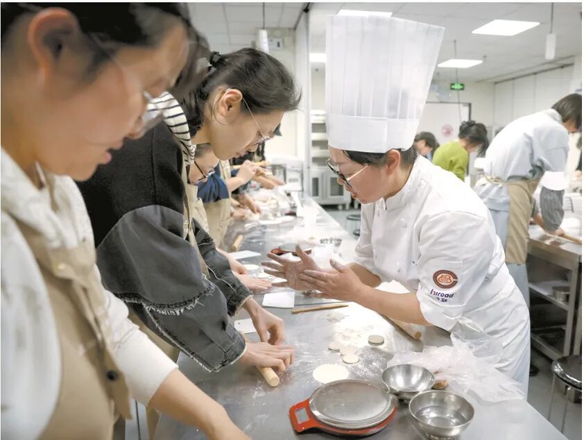 15点,一走进上海市现代食品职业技能培训中心的七楼,香味扑面而来。咖啡研习社、中式面点实训营、西点烘焙手作工坊同时开启,三门课程皆是考证筑基班。“周一正好没有课,就出来学一下烘焙,平时可以做一些点心,让家里的烤箱开开张,以后的就业也多一个方向。”00后戎佳逸从上海师范大学奉贤校区赶来,跟着西点课老师陈秋云学做杏仁饼干。