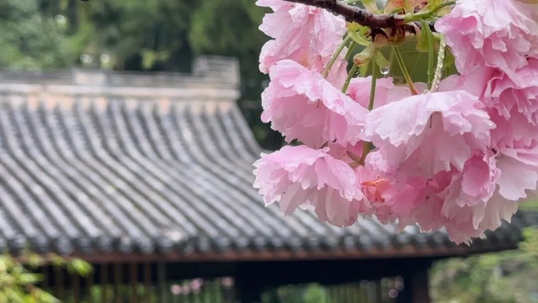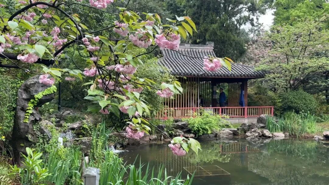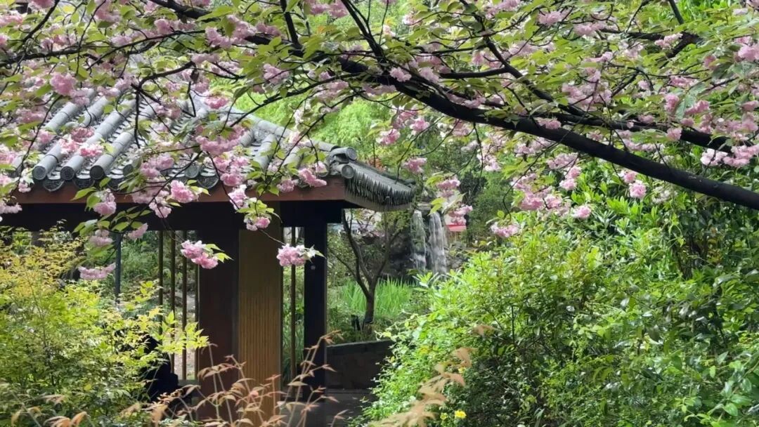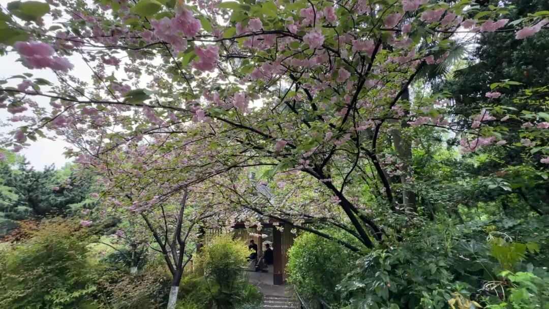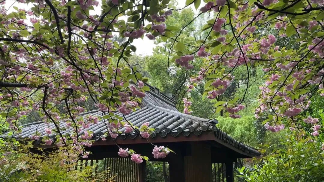 亭台楼阁与盛开的晚樱相映成趣