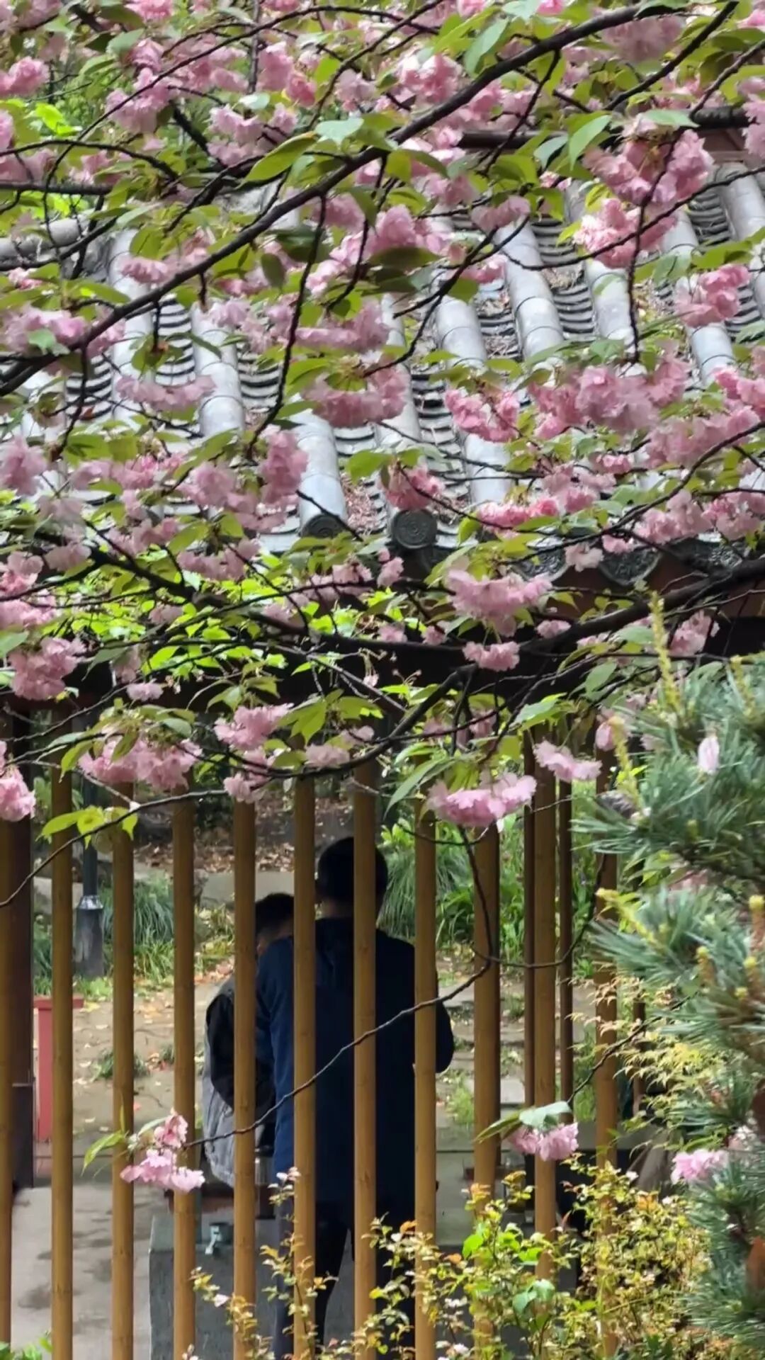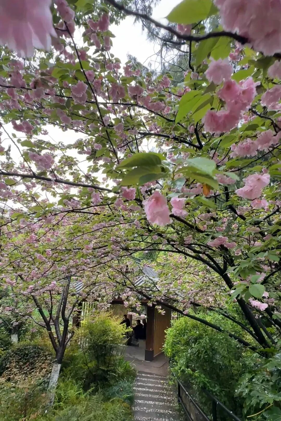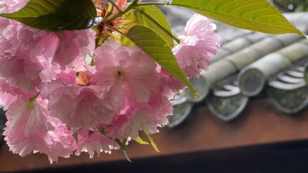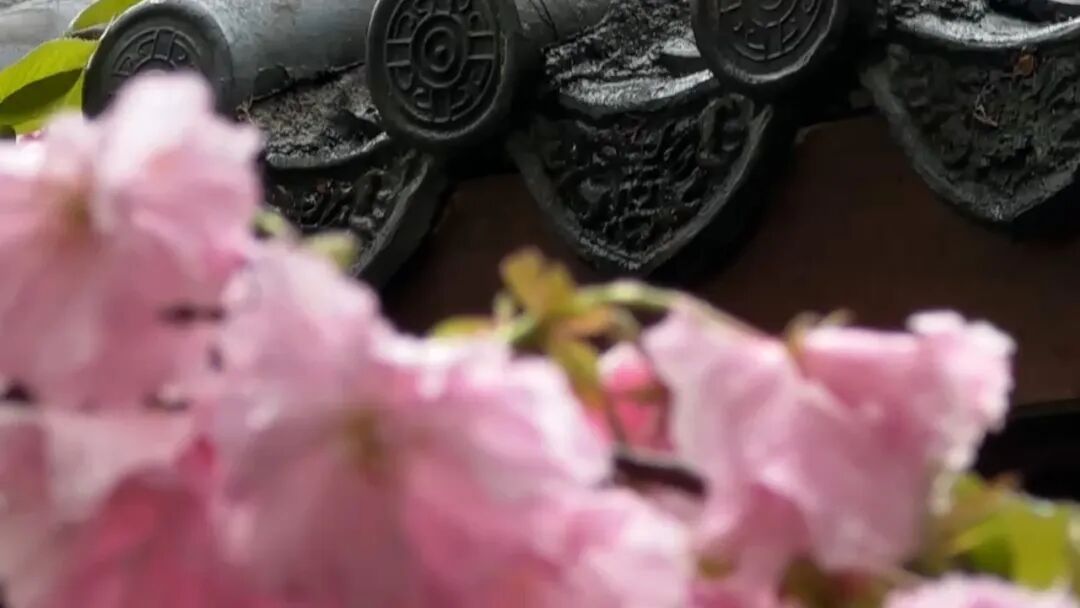 亭台楼阁与盛开的晚樱相映成趣