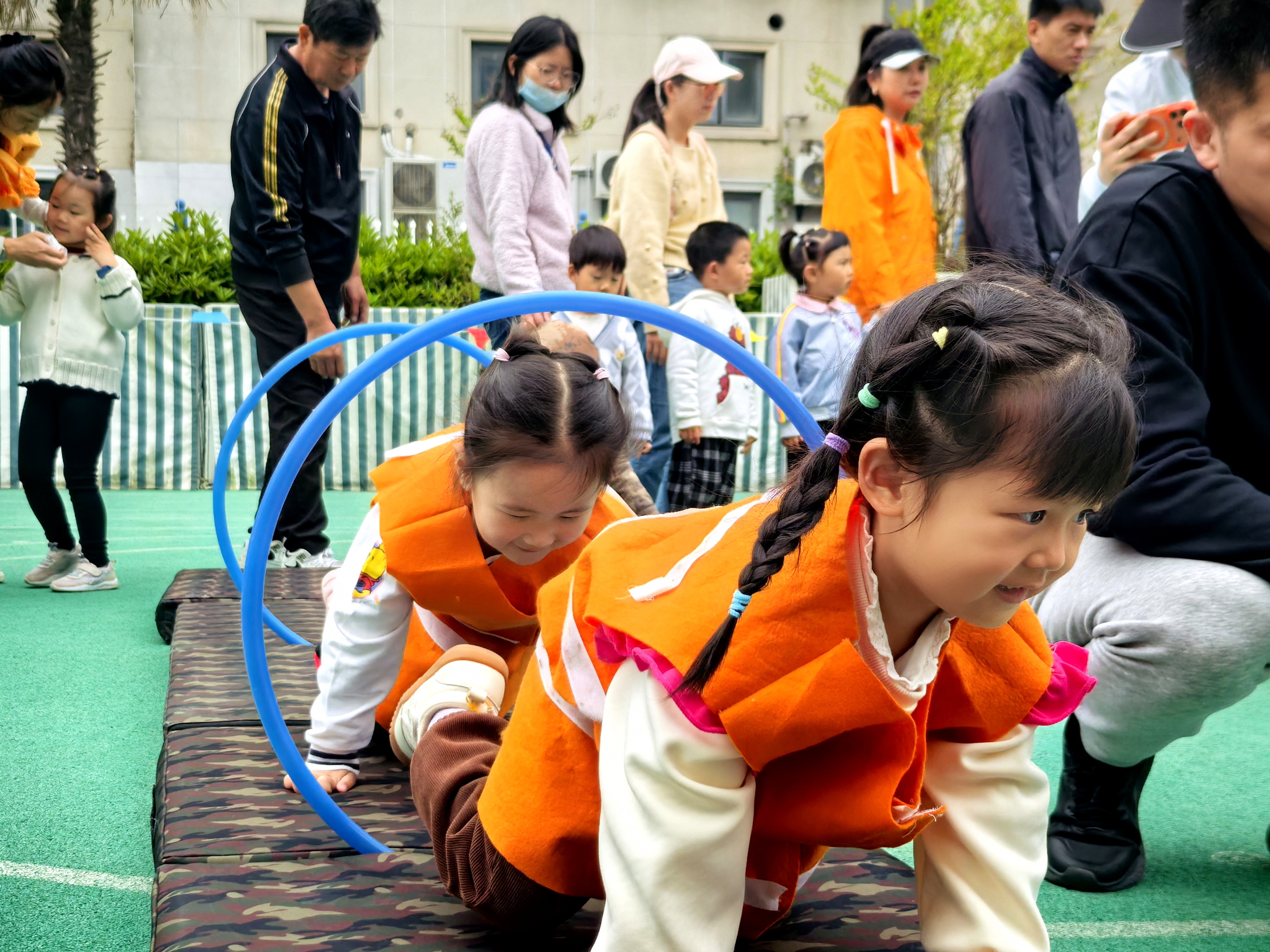 一早,“万马奔腾”“蚂蚁运粮”“海狮顶球”“袋鼠一家跳跳跳”“小猪要回家”“小牛拉车”等十多个游戏项目在操场上分区设置。孩子们以爬、跳、滚、跑等动作灵活穿行其间。家长们除了专注为孩子拍照记录,也加入其中,陪伴孩子一起完成挑战。一时间,操场成了欢乐的海洋。
