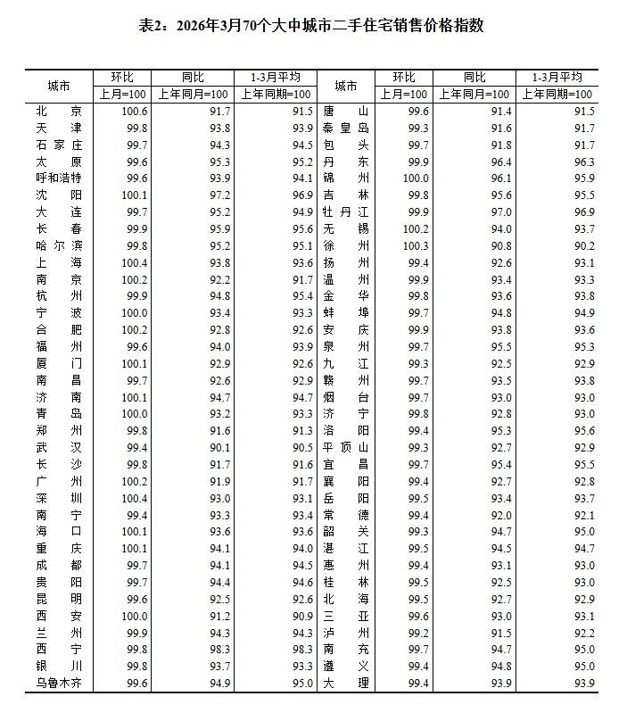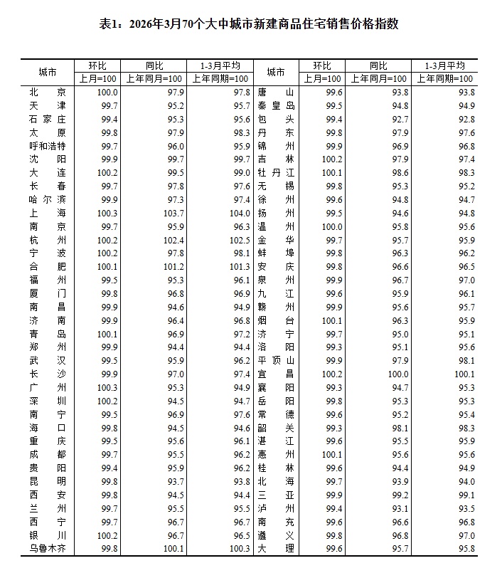 2026年3月份,70个大中城市中,一线城市商品住宅销售价格环比上涨,二三线城市环比降幅收窄或相同。新建商品住宅和二手住宅销售价格环比上涨城市个数均比上月增加。