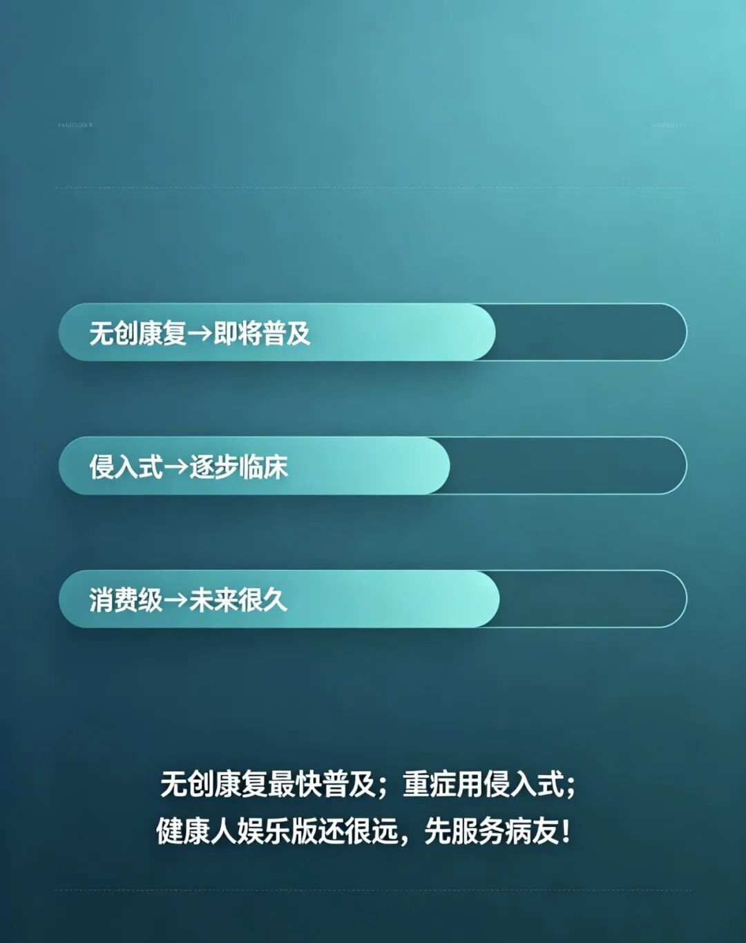 脑机接口的临床落地与“人机共生”不宜过度乐观预判,应遵循分层递进、逐步落地的规律,不同技术与场景的推进节奏差异极大: