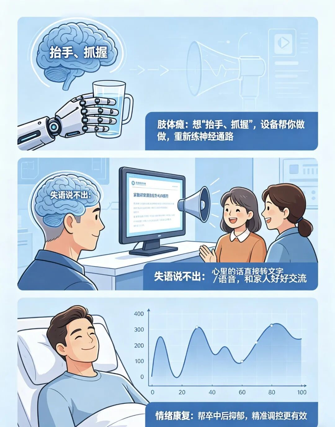情绪障碍治疗上,脑机接口可实时监测脑状态并开展个体化干预,为难治性抑郁症提供新方向。