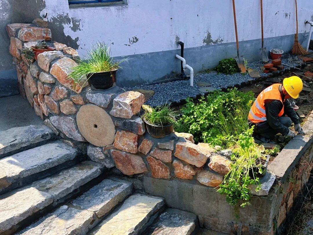 打造小三园时,他就地取材砌石墙,村民想把花盆固定在墙头,他一口答应并巧妙砌稳,用诚心与村民共创乡村自然之美。