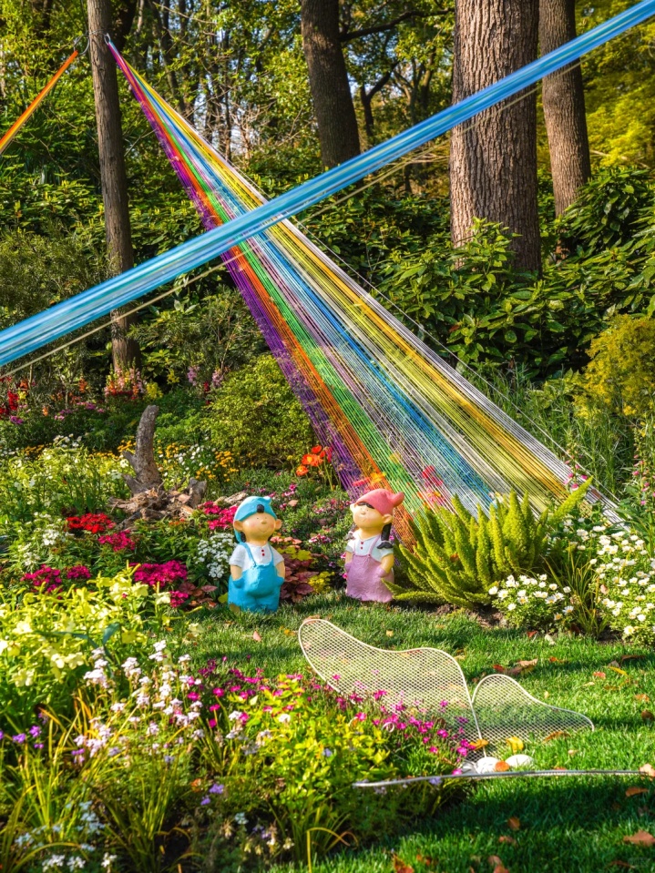 走进“七彩森林”展区,河岸两侧蓝紫色花境层层铺展,喜林草、冰岛虞美人、花菱草错落交织,搭配河面早开睡莲与抽象拱桥,水光花影相映,随手一拍都是油画大片。