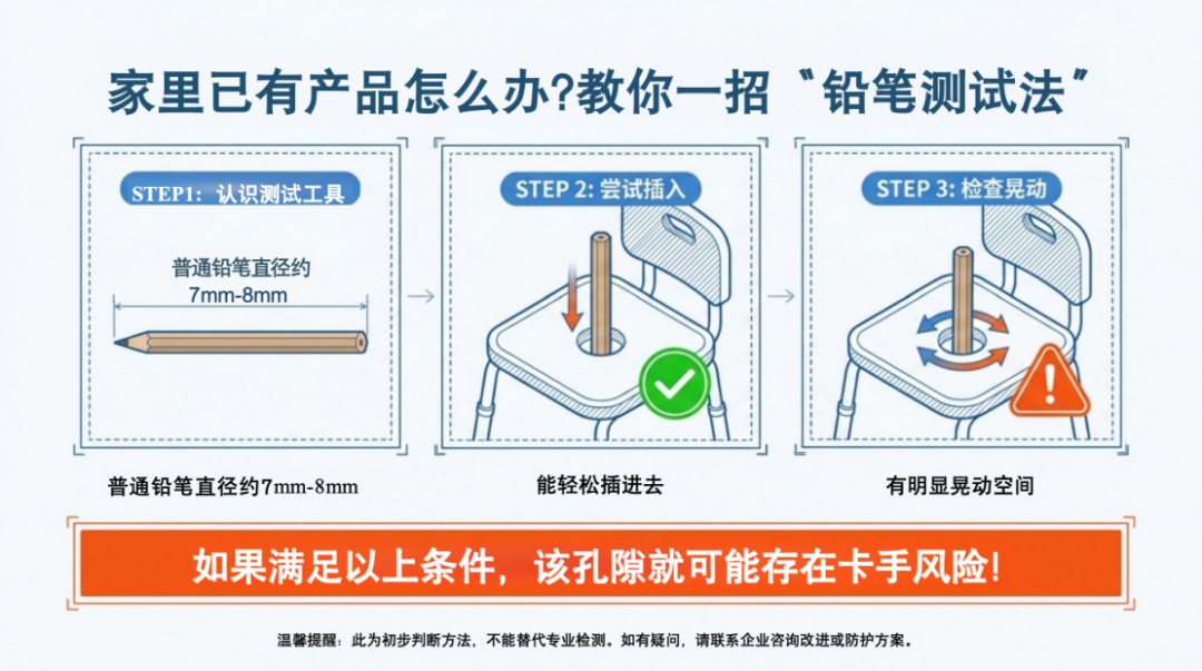教大家一个直观的小方法——“铅笔测试法”,用一支直径约7mm-8mm的普通铅笔试一试:能插进去,还有明显晃动空间,那这个孔隙可能存在卡手风险
