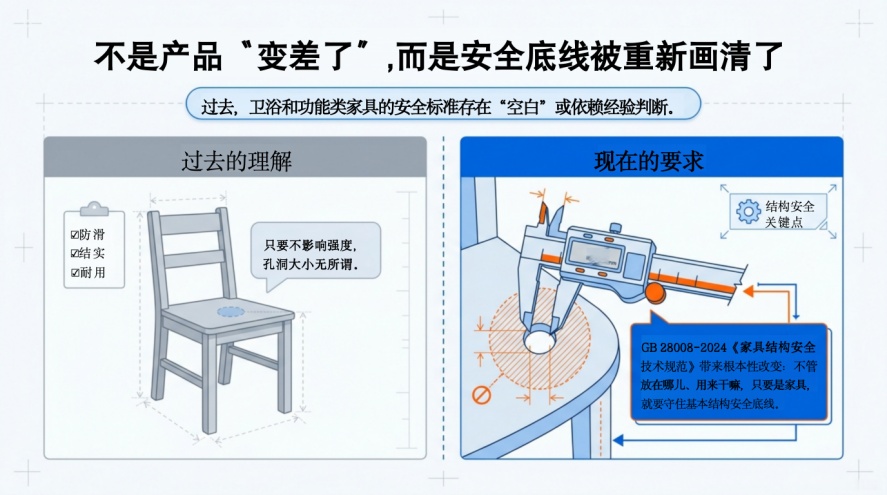 过去,一些家具(尤其是卫浴、功能类产品),在标准适用上存在分散甚至“空白”的情况。而随着 GB 28008-2024《家具结构安全技术规范》的实施,一个更明确的原则被提出:家具产品原则上应满足通用结构安全要求,避免结构性伤害风险。简单讲一句话:不管放在哪儿、用来干嘛,只要是家具,就要守住基本安全底线。过去一些依赖“经验判断”的设计,在新标准下,必须重新审视。