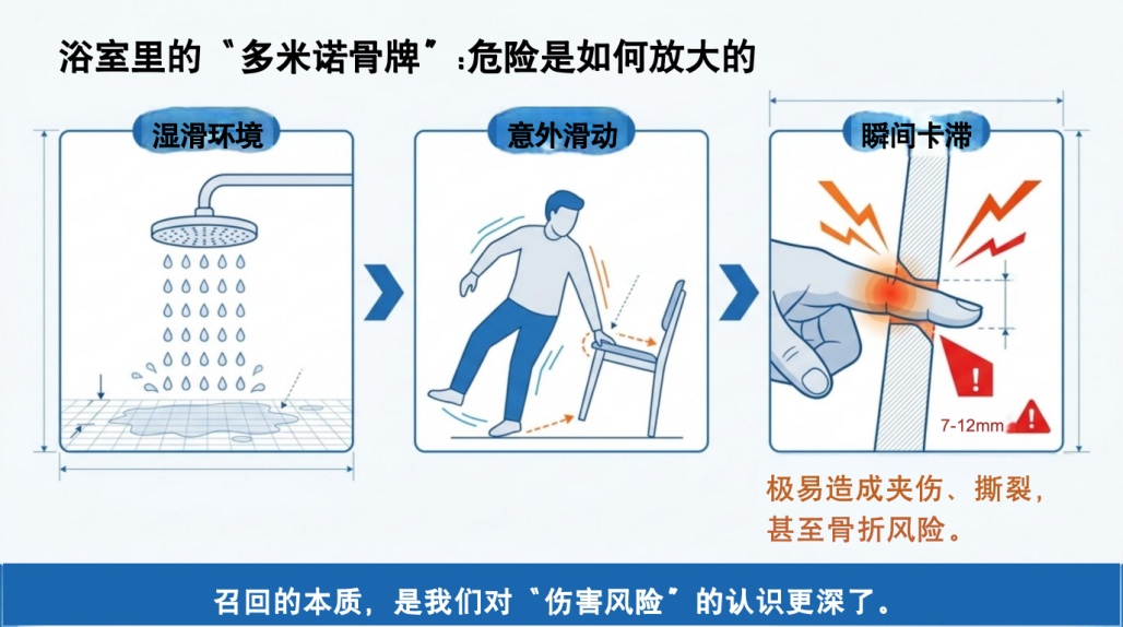 因为这是一个典型的“危险尺寸”:手指容易伸进去,却不容易顺利脱出,尤其是在浴室这种湿滑环境下:一旦起身或滑动时被卡住,可能造成夹伤、撕裂,甚至骨折风险。