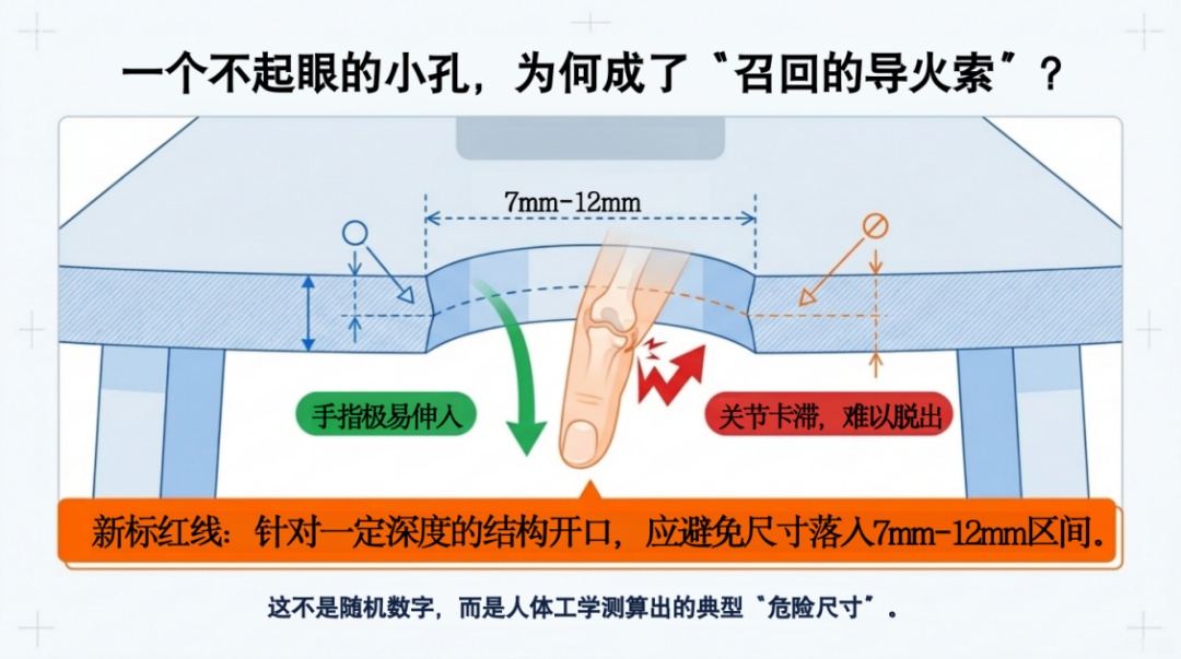 应避免家具孔穴、开口或间隙尺寸落入 7mm—12mm 的区间(针对一定深度的结构开口)。