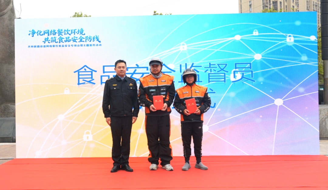 此外,共和新路街道聘用两名网约配送员作为“食品安全监督员”,呼吁其充分发挥配送员贴近商户、直达后厨、覆盖面广的优势,当好食品安全宣传员、提醒员、监督员,构建移动化、常态化一线监督防线。同时,为网络餐饮商户们发放食安封签,倡导其全面落实“一餐一封签”,有效防范餐品在配送环节被污染的风险。
