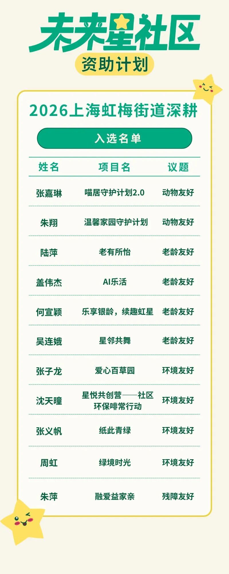 经过四个小时的深度碰撞与交流,11个兼具实用性与创新性的项目获得专家认可,将纳入2026年“未来星社区”资助计划。这些项目覆盖动物友好、老龄友好、残障友好、环境友好四大议题,遍及虹梅街道多个片区。未来半年,项目行动者将把交流中许下的承诺,变成虹梅街巷里弄触手可及的改变。