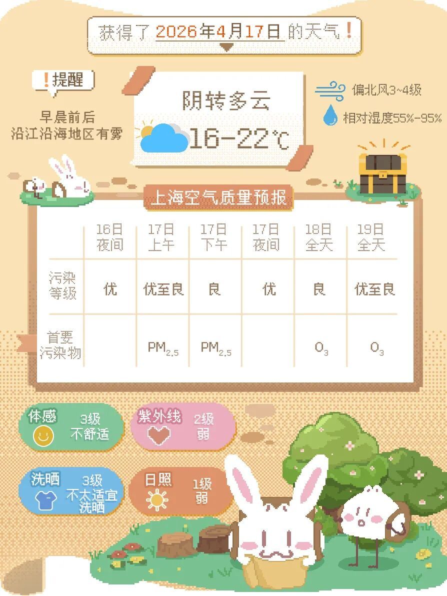 今天(4月17日)上午阴到多云局部地区有短时小雨,对出行影响不大,中午前后转多云到阴,阳光忽隐忽现。早晨各区气温在15~16℃附近,预计最高气温22℃。北到西北风3~4级,中午转北到东北风3~4级,沿江沿海地区4~5级。相对湿度95%~55%。