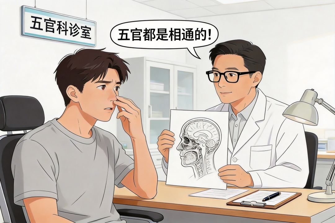 这个问题很常见。鼻腔、眼睛和咽喉,甚至是中耳,其实并不完全是“各管各的”。鼻腔和眼部之间有泪道相通,和中耳有咽鼓管相通,况且鼻腔的分泌物还会向后流向咽喉部。