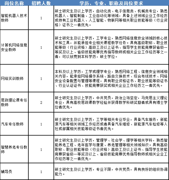 3.所学专业与应聘专业一致或相关。具备岗位所需的专业知识和技能,能够胜任教学、科研等工作。具有丰富的企业工作经验、国家级/省部级技能竞赛(世界技能大赛等)指导经验等优先。