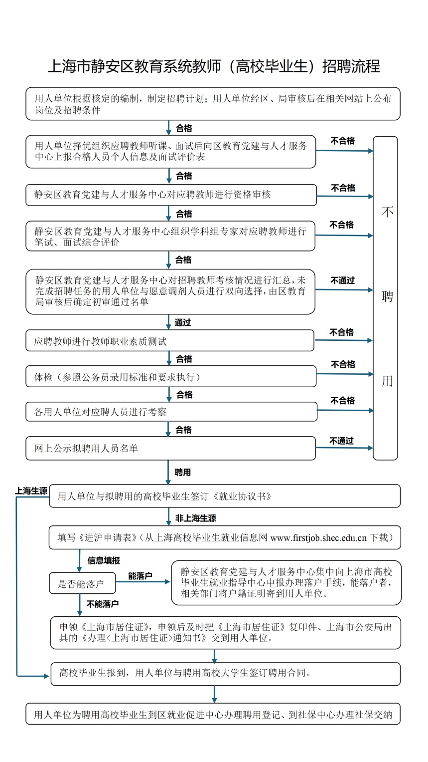 拟聘用教师须进行教师职业素质测试,委托专业人才测评机构进行,体检、考察工作参照公务员录用标准和要求执行。拟聘用教师名单在“上海静安”门户网站公示5个工作日,同时公布监督(举报)电话,接受社会监督。