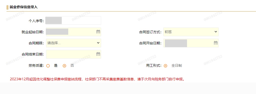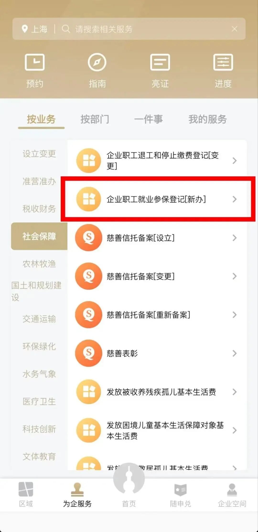 “企业职工就业参保登记” 网上办指南 01 第一步 登录“一网通办”(网址:https://zwdt.sh.gov.cn)平台首页,在搜索框录入“企业职工就业参保登记”,点击智能检索按钮,在搜索结果中找到该事项,点击右侧的“立即办理”,系统将自动跳转至办理页面。 02 第二步:维护员工信息 1、录入需办理职工的证件号码和姓名,点击“登记”。 2、若需修改联系地址、邮编、联系电话,请点击“个人联系信息”部分的“编辑”按钮进行修改。 (1)修改联系电话:点击联系电话上方的“编辑”,录入信息后点击“确定”。 (2)修改联系地址:点击默认的联系地址,点击“修改”(无默认联系地址的,可直接点击“增加”)。 3、录入时“区县”“XX路”“XX号”字段需通过输入关键字后从下拉框中点选的方式录入(如:录入上海市嘉定区,可在框中录入“嘉定”,再从下拉框中点选“上海市嘉定区”),编辑完成后点击“确定”按钮。 小贴士 若联系信息为空,或者为外省市地址,将影响就业参保的正常办理,请确保信息维护到位哦~ 4、全部信息维护到位后,点击“下一步”,跳转后点击“确认提交”即可完成地址修改。 5、页面出现以下提示即表示联系信息的修改申请成功。 完成后点击“关闭”,即可跳转回到企业职工就业参保登记页面。 03 第三步:录用就业参保信息 1、在“就业参保信息录入”选项卡中录入“个人序号”“就业起始日期”等劳动就业相关信息,完成信息录入后点击“下一步”。 2、确定申报信息无误后,点击“确认提交”。 3、页面出现以下提示,即表示申请成功。 如继续办理其他职工的就业参保登记手续,请点击“继续受理”。 “企业职工就业参保登记” 掌上办指南 01 第一步 企业用户先登录“随申办企业云”APP,点击屏幕左下角【为企服务】。 02 第二步 先点击左侧【社会保障】,再点击右侧【企业职工就业参保登记[新办]】。 03 第三步 进入“校验身份”页面,分别填写职工的“姓名”“证件号码”,核对无误后点击【确认提交】。 04 第四步 进入“填写资料”页面,在“就业参保信息录入”栏目进行相关项目申报。其中“就业起始日期”“合同开始日期”默认申请当日,可修改;“用工形式”默认“全日制”,线上申请不可修改;其他项目根据实际情况进行选择。 05 第五步 确认无误后,点击屏幕下端【确认提交】。 06 第六步 系统弹窗提示校验结果,点击【确认】后,页面提示“提交完成”,即为申办成功。点击【操作完成】,可继续申办其他业务。 图片部分由AI辅助生成