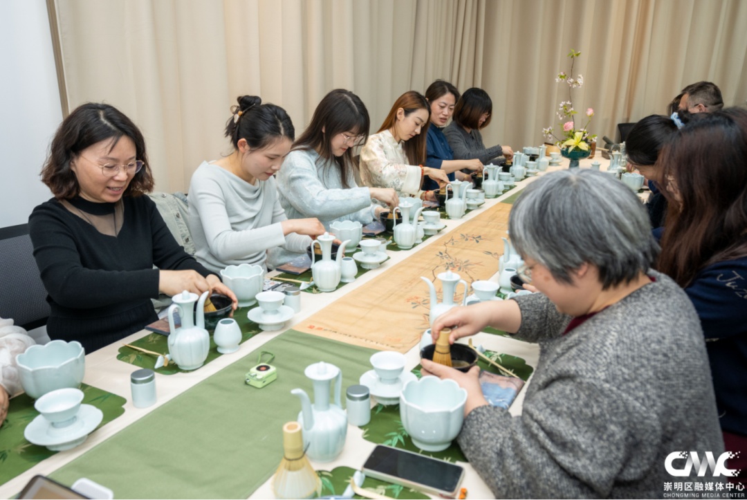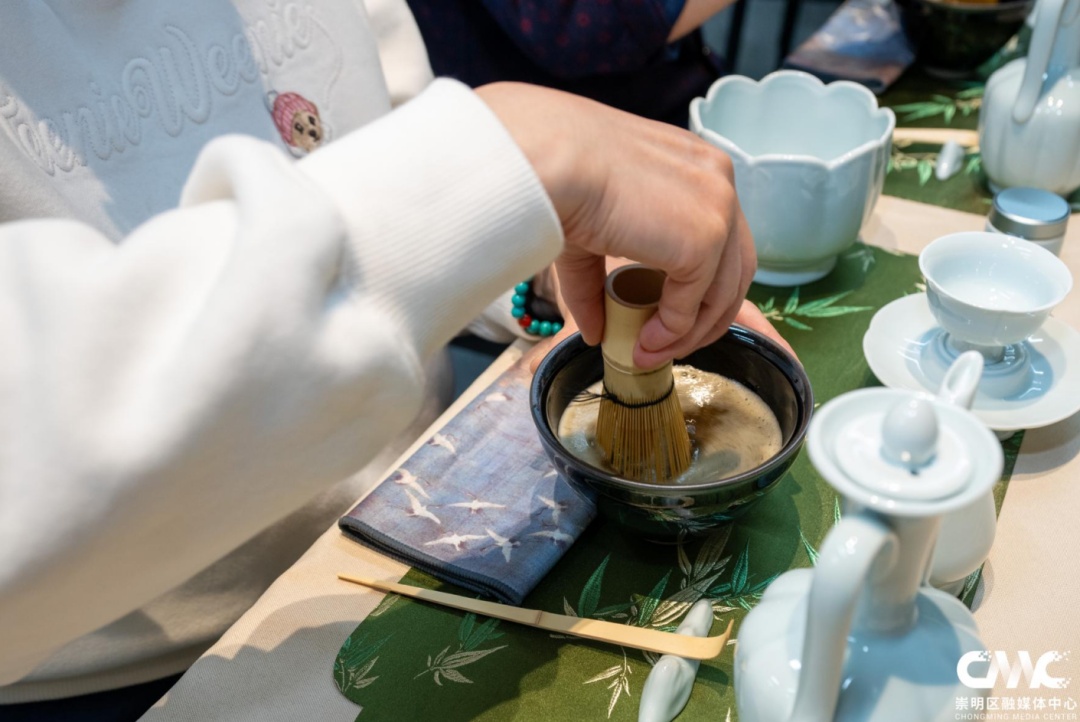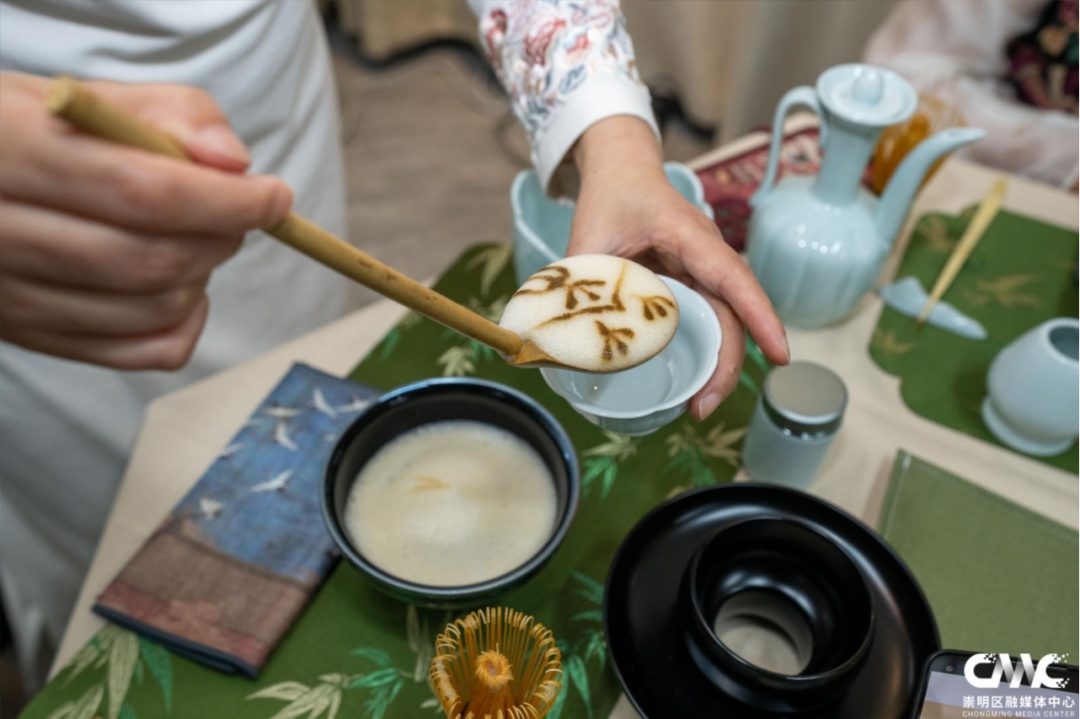 午间时段,区社区学院活动室内茶香四溢。茶艺老师正细致讲解宋代点茶的文化历史和基本知识,随后指导学员们亲身体验,大家一手执壶,一手扶盏,来回摆动着手腕,泡沫汤花打击着盏壁,点出一碗碗“雪沫乳花”。“点茶”之后便是“茶百戏”,学员们在浮沫上绘画写字,沉浸式体验宋代点茶文化的滋味与神韵。
