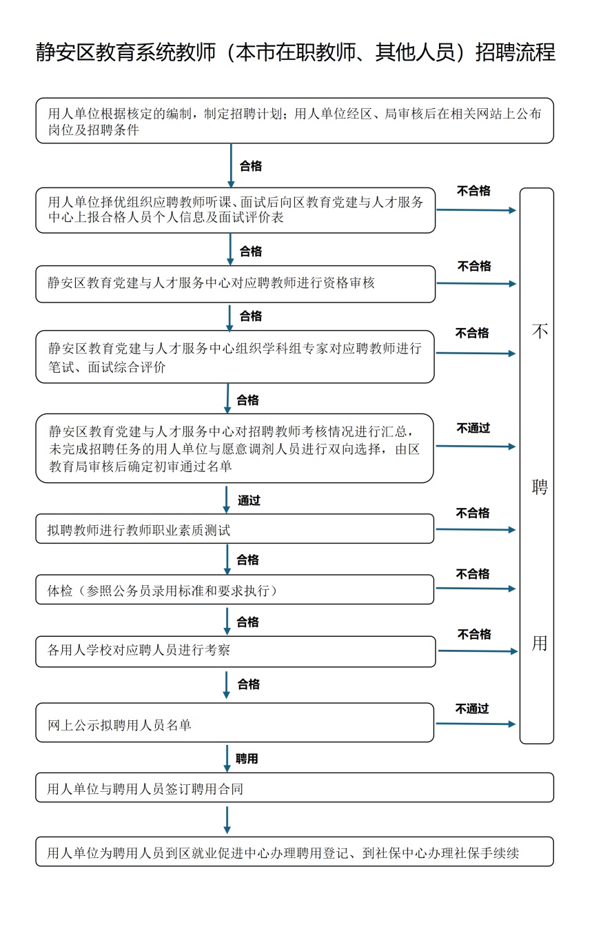 拟聘用教师须进行教师职业素质测试,委托专业人才测评机构进行,体检、考察工作参照公务员录用标准和要求执行。拟聘用教师名单在“上海静安”门户网站公示5个工作日,同时公布监督(举报)电话,接受社会监督。