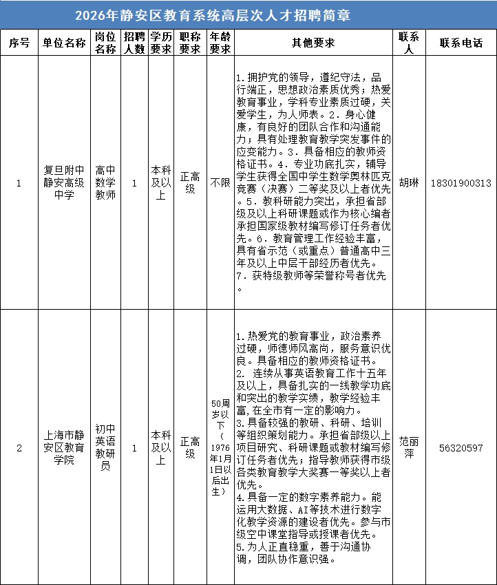 7.应聘人员应该符合招聘条件,对于特别优秀的正高级专业技术人员可放宽年龄。详见《2026年静安区教育系统教师公开招聘计划(第二批)》及《2026年静安区教育系统高层次人才招聘简章》。