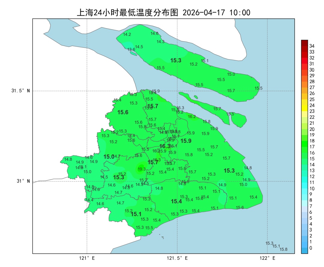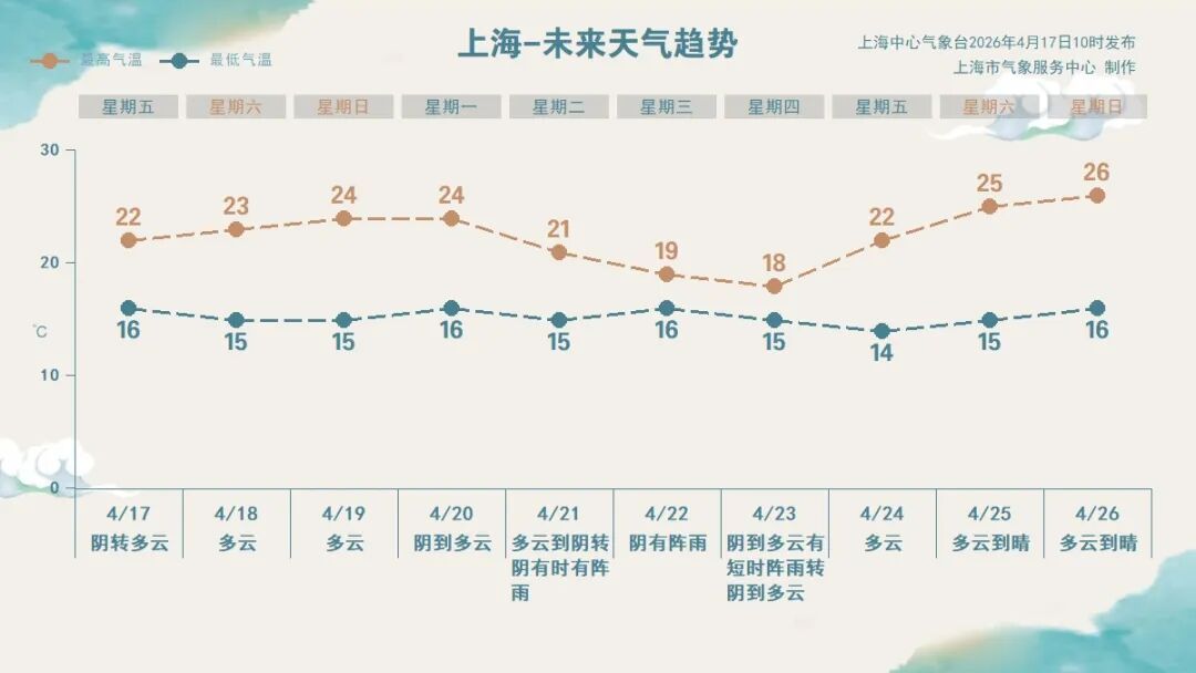 今日天气:白天云系仍较多。北到西北风3~4级,中午转北到东北风3~4级,沿江沿海地区4~5级,相对湿度95%~55%。体感较为舒适。 天气趋势:本周六到下周二前期,上海以多云为主。降雨间歇期间可能会出现低能见度。下周二后期至周四,受气旋波动影响,本市将有一次明显的降雨天气过程,并伴有大风。未来一周,上海的气温总体稳定在15~24℃之间,早晚凉,白天舒适。春季天气多变,请大家多多留意临近的预报预警信息。 资料:上海天气发布 编辑:姜天澍