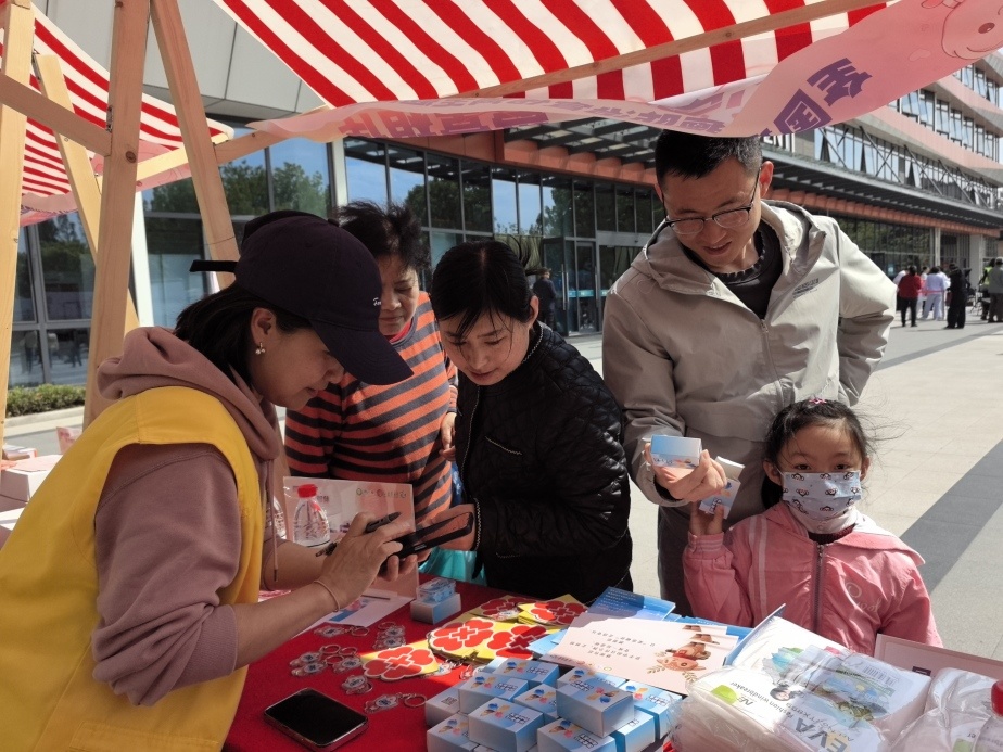 义卖区,来自企业、志愿者和社会爱心人士捐赠的手工艺品、书籍、家居小物摆满了长桌。带孩子来看病的李女士经过摊位时,选了一把伞和一本旧书,“一点小心意。”她说,“希望这份正能量帮到正在抗癌的人,让他们知道,有人在惦记着他们。”