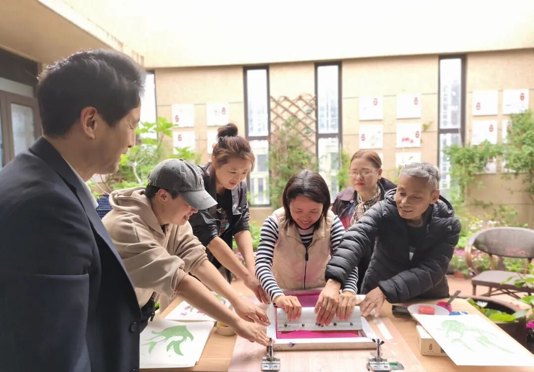 最激动人心的环节当属亲手印制《春日郁金香》。老人们小心翼翼地将颜料透过丝网刮印在纸上,当一朵鲜活的郁金香渐渐浮现,现场响起阵阵惊叹。“看!我的花颜色多漂亮!”一位阿姨举着作品笑得合不拢嘴。大家互相展示、交流心得,露台上的欢笑声此起彼伏。