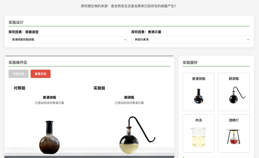 “巴斯德鹅颈瓶实验”则是科学史上一个经典实验。学生可以拖动界面右侧的普通烧瓶和鹅颈瓶,将肉汤加热。点击“开始实验”后,普通烧瓶中的肉汤很快变浑浊(表明微生物滋生),而鹅颈瓶中的肉汤保持澄清。通过对比,学生亲自验证了“微生物不是自然发生的,而是由原来已经存在的细菌产生”这一结论,深刻理解巴斯德鹅颈瓶实验的设计精髓。