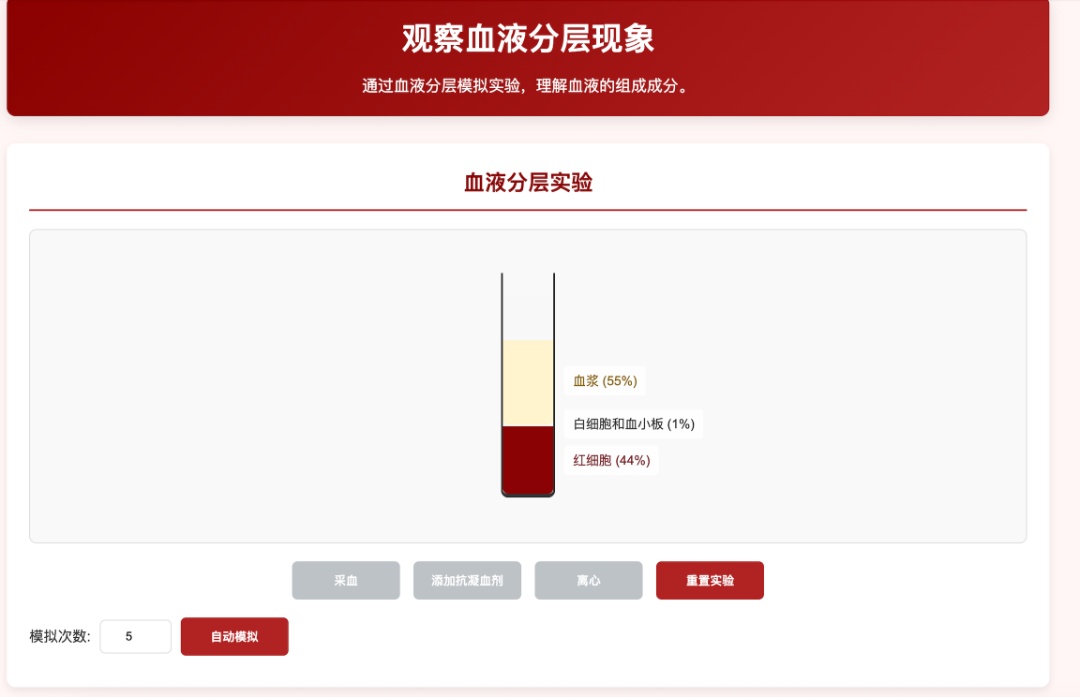 以初中“人体的营养与健康”中的重要实验“观察血液分层现象”为例。学生在模拟实验室界面中,依次点击“采血”“添加抗凝血剂”“离心”,试管中的血液便会清晰分为三层:血浆(约55%)、白细胞和血小板(约1%)、红细胞(约44%)。每一步操作都有提示,且可反复模拟,帮助学生直观理解血液的组成成分,弥补了真实实验中血样获取难、分层观察不清晰的痛点。