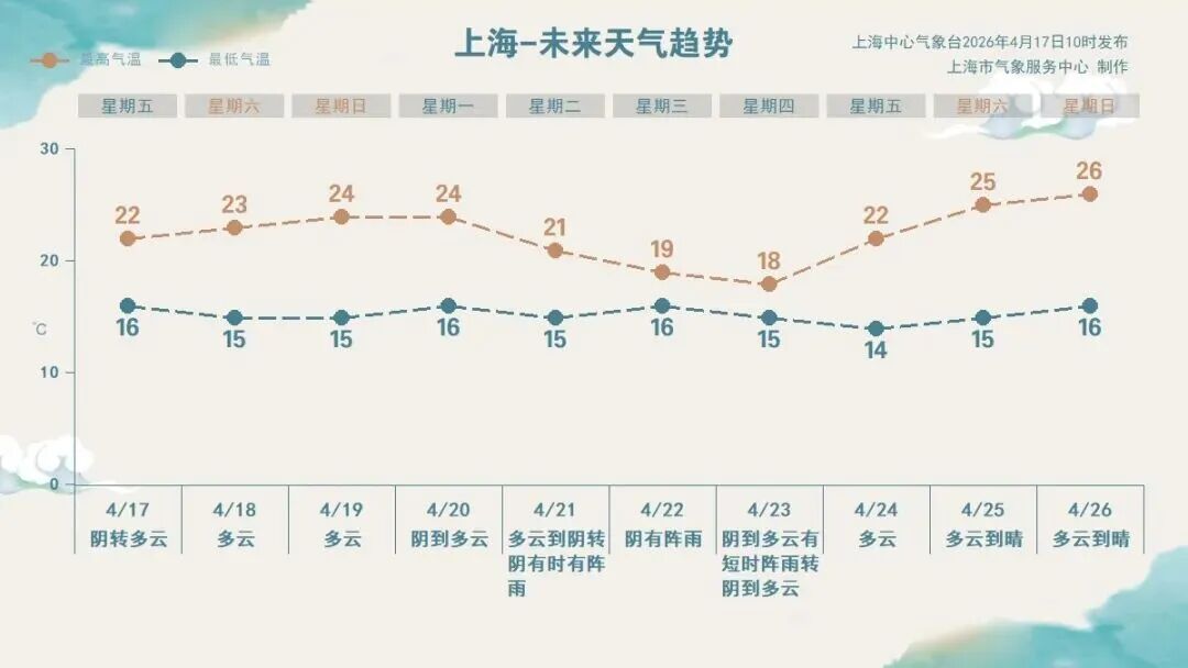 今天(4月17日)申城清晨的短时小雨转瞬即逝,并未打乱出行节奏。白天气温在15~22℃之间,北到西北风3~4级,体感舒适宜人,一件轻薄开衫就能自在出门,不用被厚重衣物束缚。