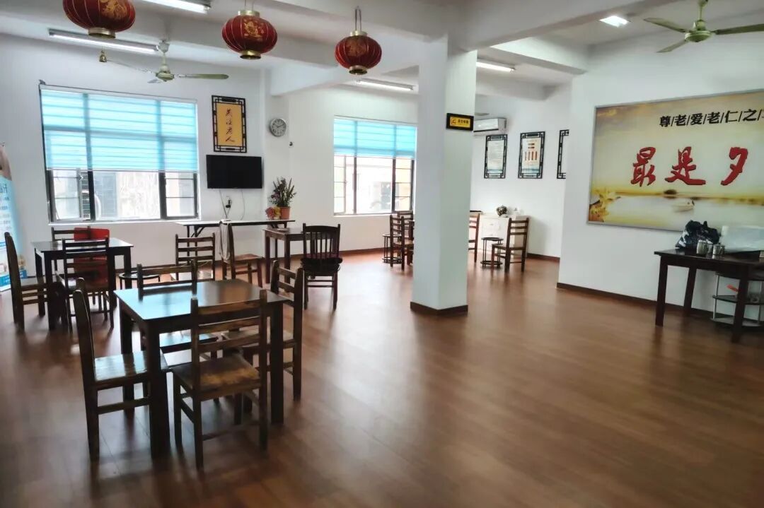 工程历时半个月,完成了从内到外的全面升级:更换稳固耐用的适老桌椅,重新铺设防滑地板,对墙面进行铲除修补与粉刷,并换装了干净整洁的新窗帘。