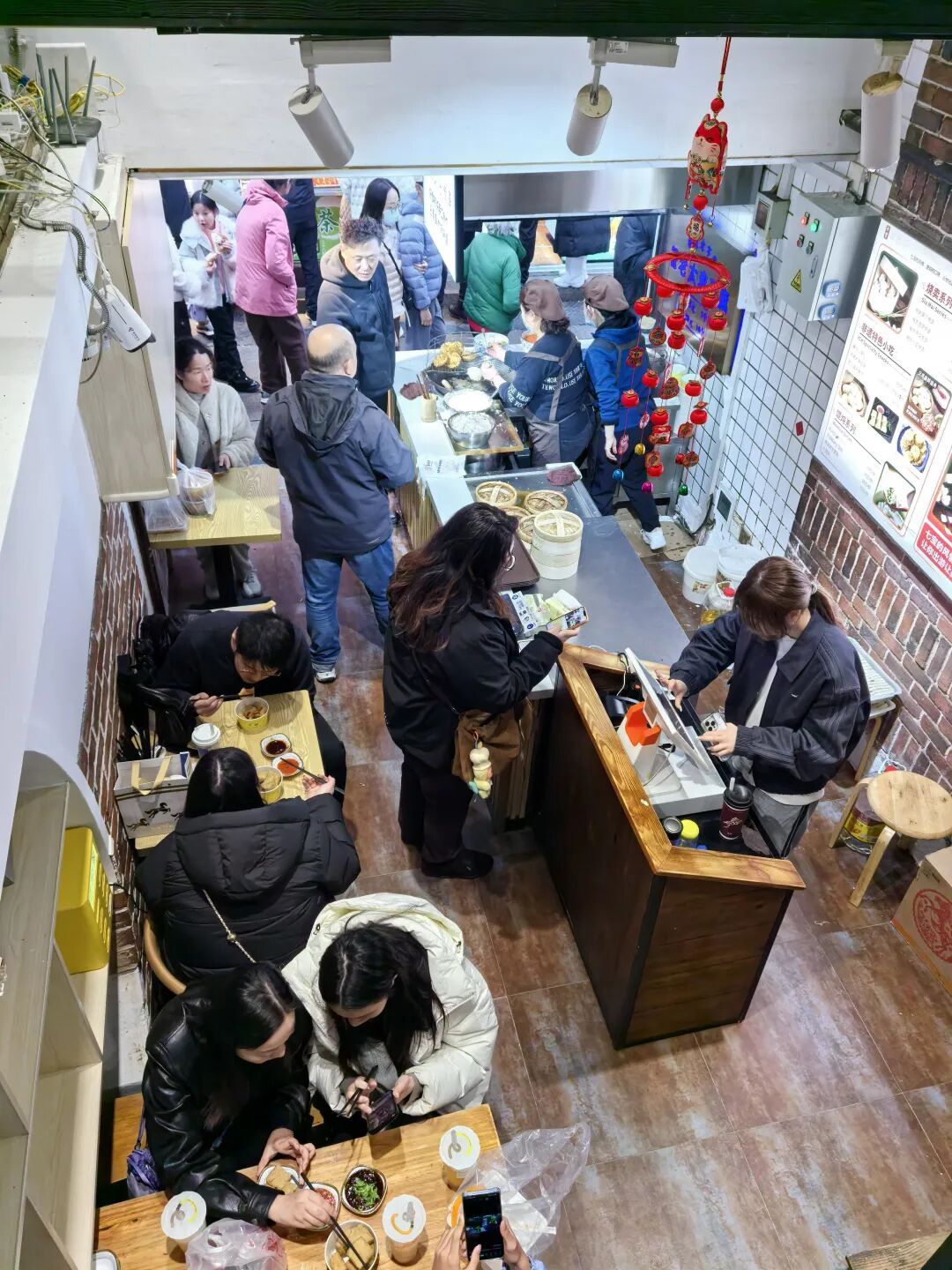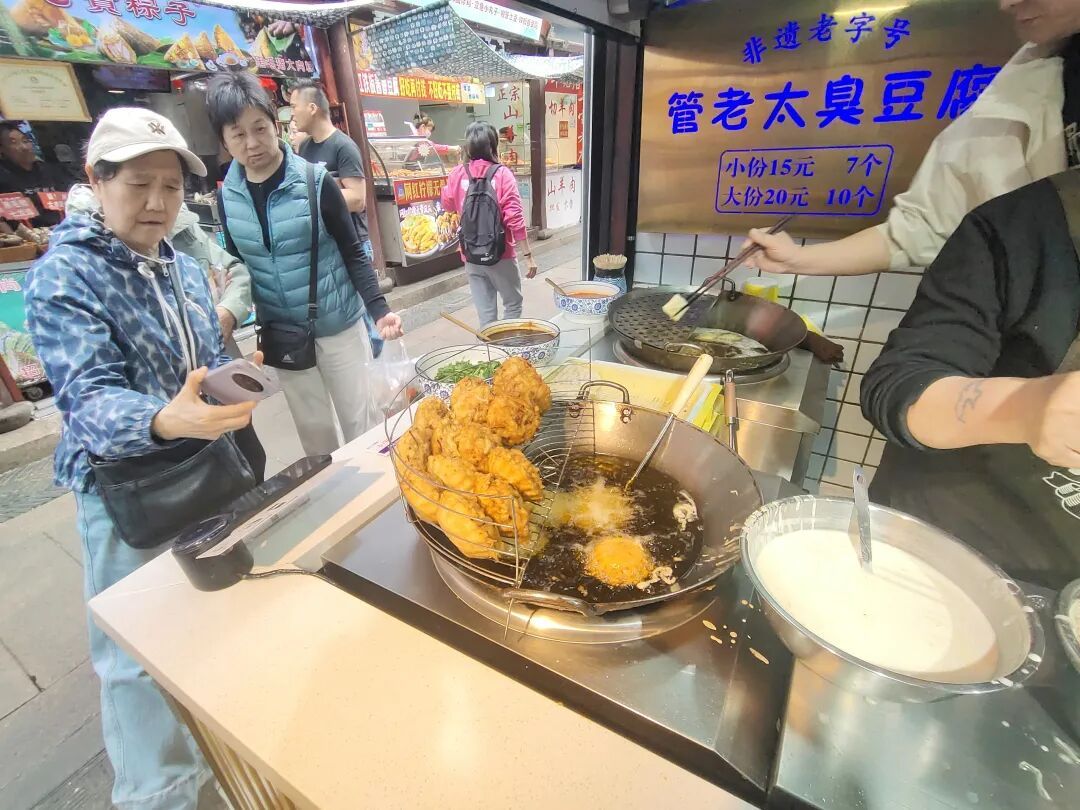 从臭豆腐、油墩子“起家”到2026年初完成改造升级,宝悦丰的生意变得更加红火。前不久的清明假期,游客们在炸油墩子的锅旁围成一圈,“店铺上下两层都坐满了”。有年轻人怀着好奇走进店里,也积累下一批回头客,其中不乏从金山、奉贤、浦东赶来的。“他们在这里吃完后,还要打包生烧卖、生馄饨带走。”邹连侠笑着说。