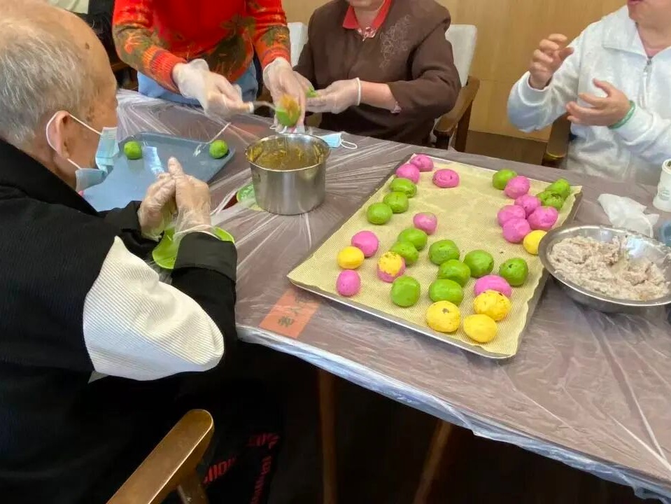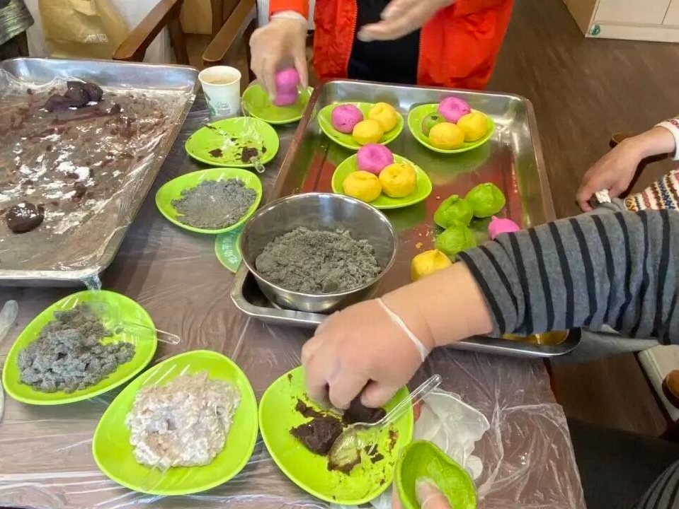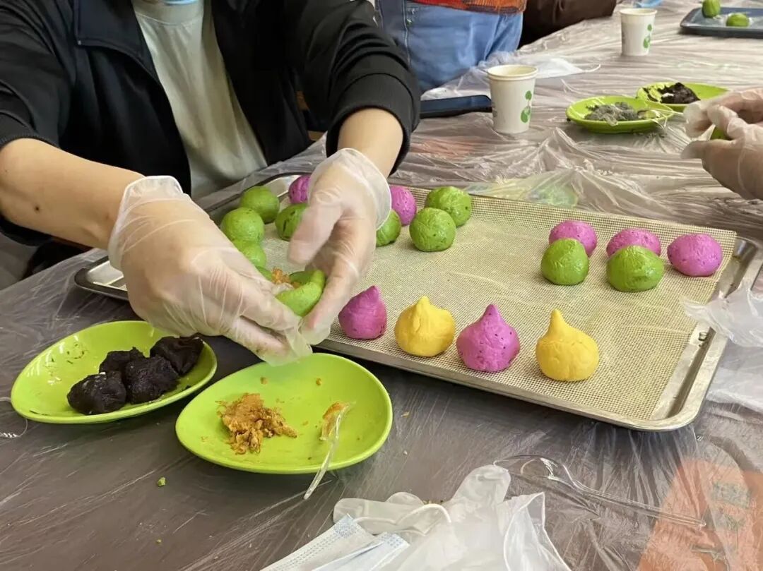 工作人员提前准备好了色彩缤纷的面团及黑芝麻、蛋黄肉松等各种馅料,兼顾甜咸不同口味。在大师傅的演示下,家人们纷纷动手包制团子。大家互相交流手法、分享经验,不一会儿,一个个造型各异的团子整齐地摆上了蒸笼。热气腾腾的团子出锅,软糯的外皮、香甜鲜美的馅料,让人垂涎三尺。