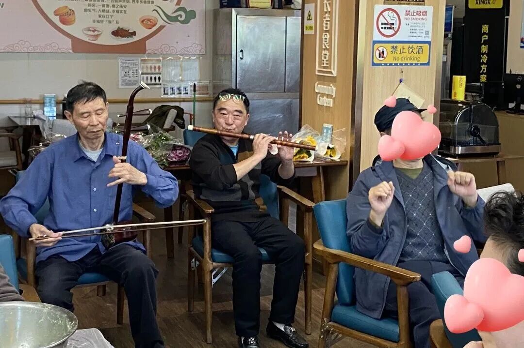 团子上锅蒸制的间隙,三位爱老家园民乐队成员热情地前来助兴。二胡、笛子等民乐齐奏,一首《洪湖水浪打浪》悠扬响起,活动室内的气氛瞬间被点燃,不少家人们跟着打起了拍子,舞动起来,一曲终了,掌声不断。