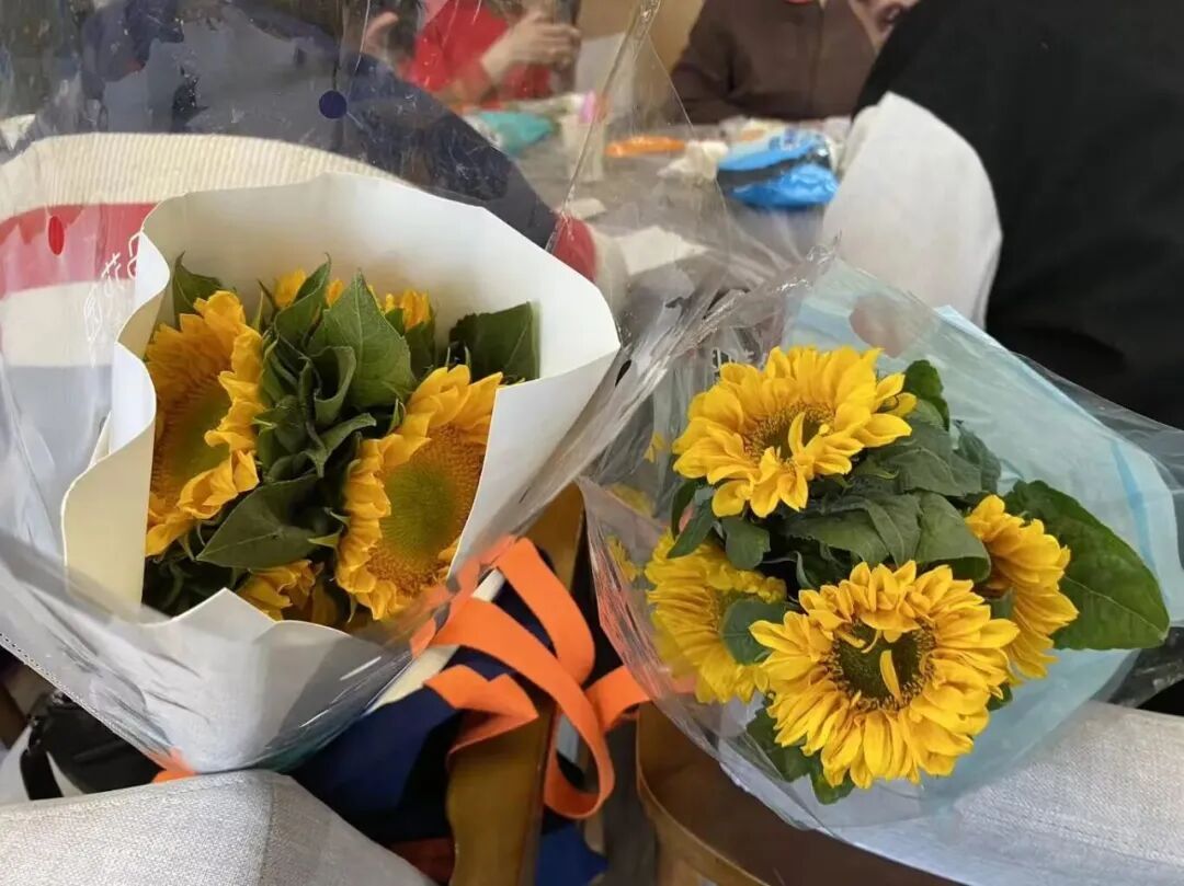 “春花挑选”环节,桌上摆满了茉莉、芍药、向日葵等各色鲜花,大家精心挑选,笑语盈盈,活动室内洋溢着春日的生机与温暖。