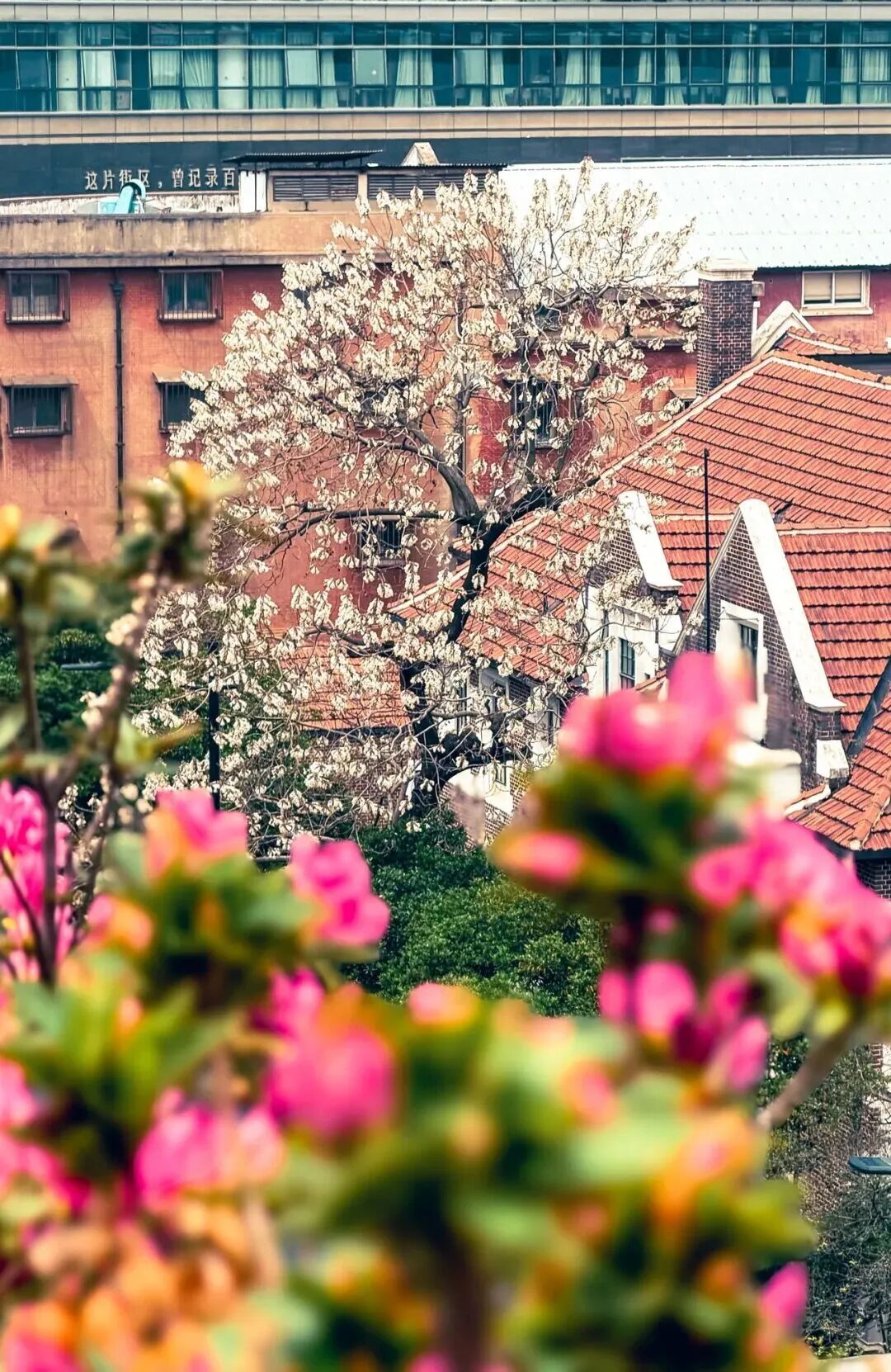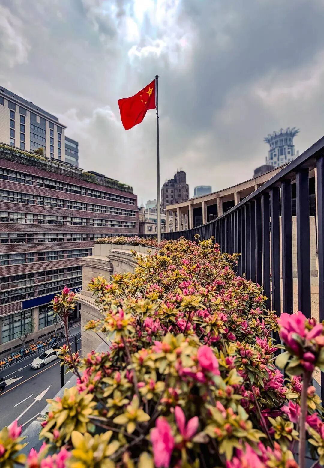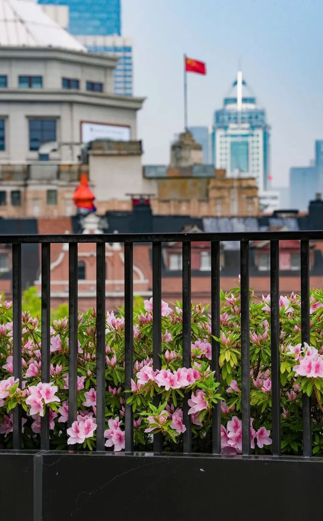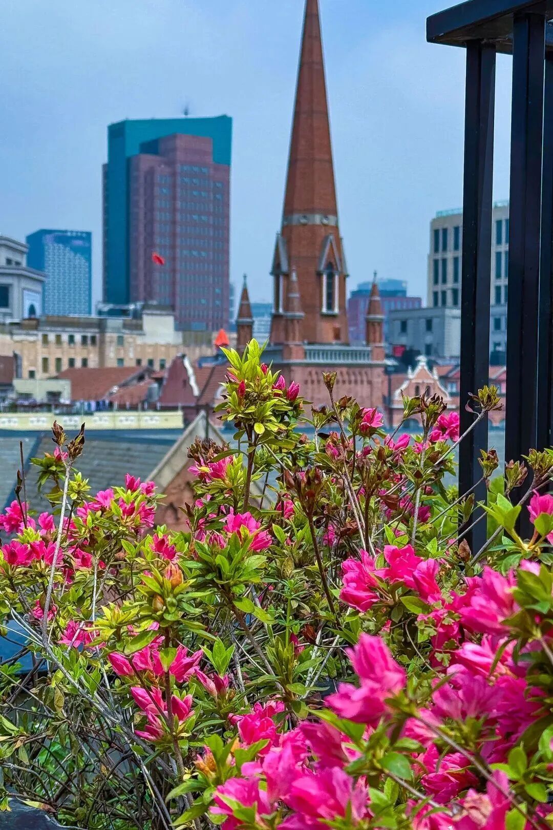 这里或许是全上海最独特的赏花视角,前景是盛放的杜鹃与飘扬的红旗,中景是始建于1866年的圣三一堂,远处的东方明珠电视塔清晰在望。