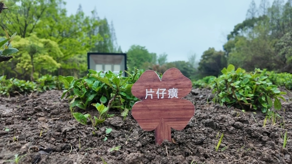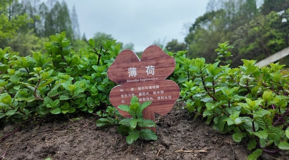 走出蟹房,屋外的空地上更是一片生机盎然。片仔癀、艾草、青蒿、薄荷等几十种常见中草药错落种植,嫩绿的枝叶在微风中摇曳,铭牌上清晰标注着药材名称与功效,成为林间一道独特的风景线,供游客观赏、辨识。