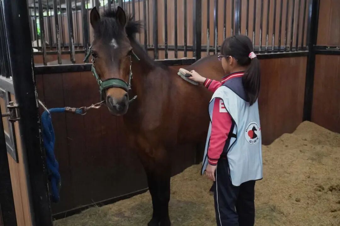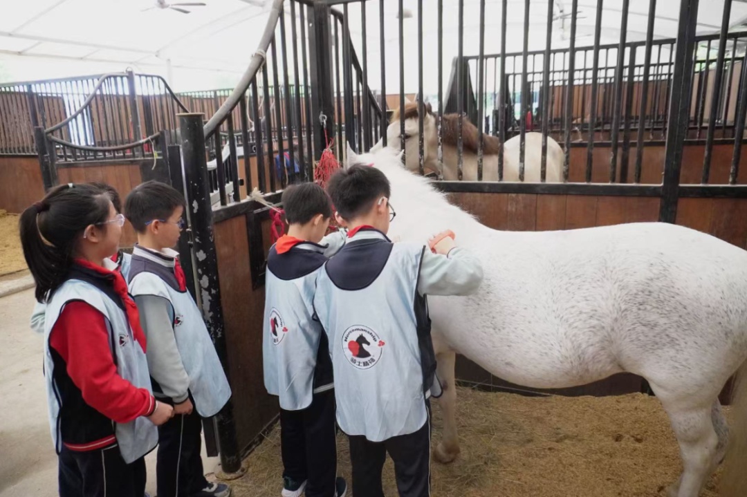 “以前只在电视上见过马,今天特别期待能亲手为它刷毛。”五年级学生赵婉宁兴奋地说。四年级的李泰然则分享了他的发现与心得:“马比想象中更温顺,只要让它们感受到善意和安全,彼此就能亲近起来。”他还认真地总结起刷马小技巧:动作要轻柔以让马儿感知,梳理鬃毛和尾巴需耐心缓慢,刷洗身体也要顺着毛发生长方向。