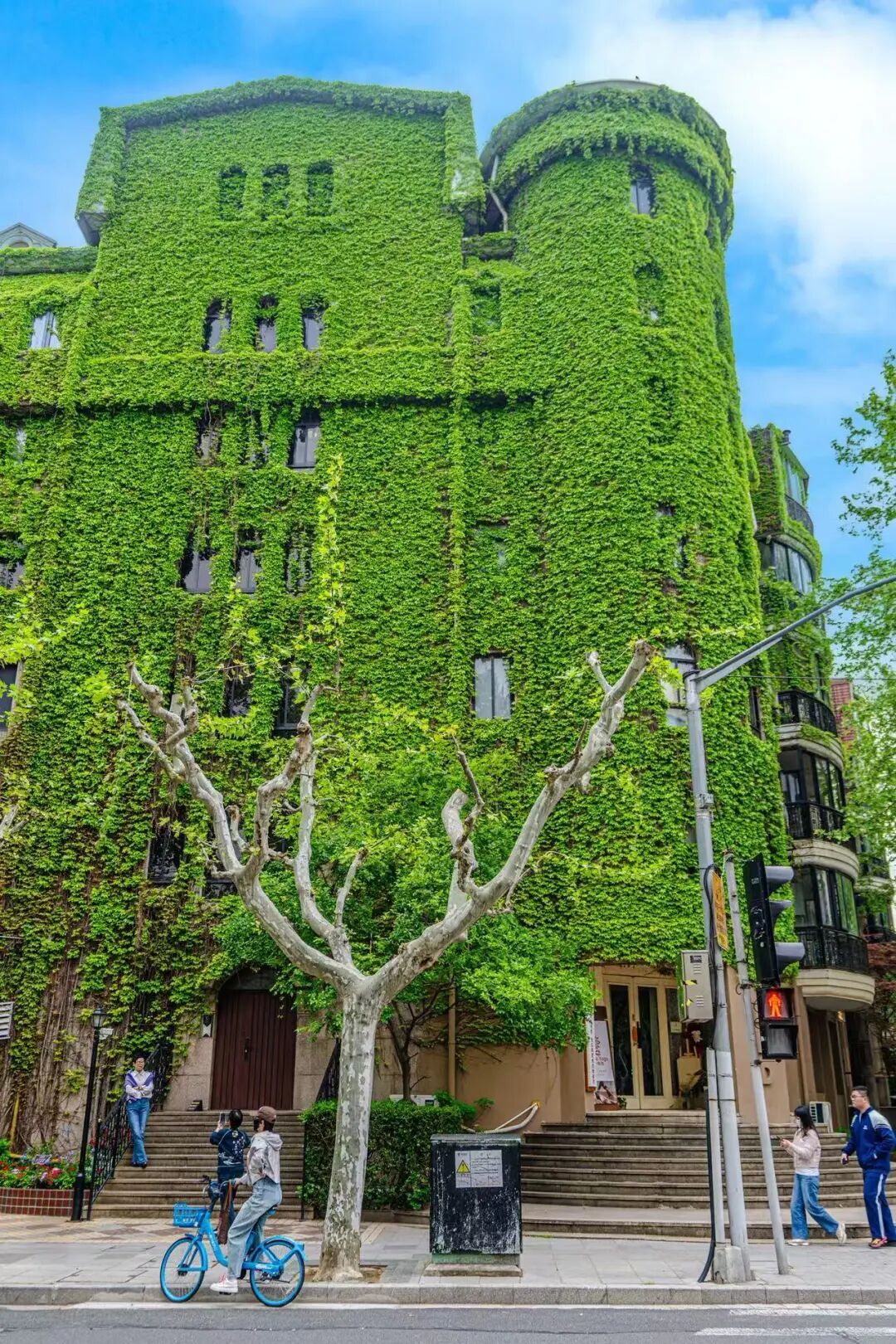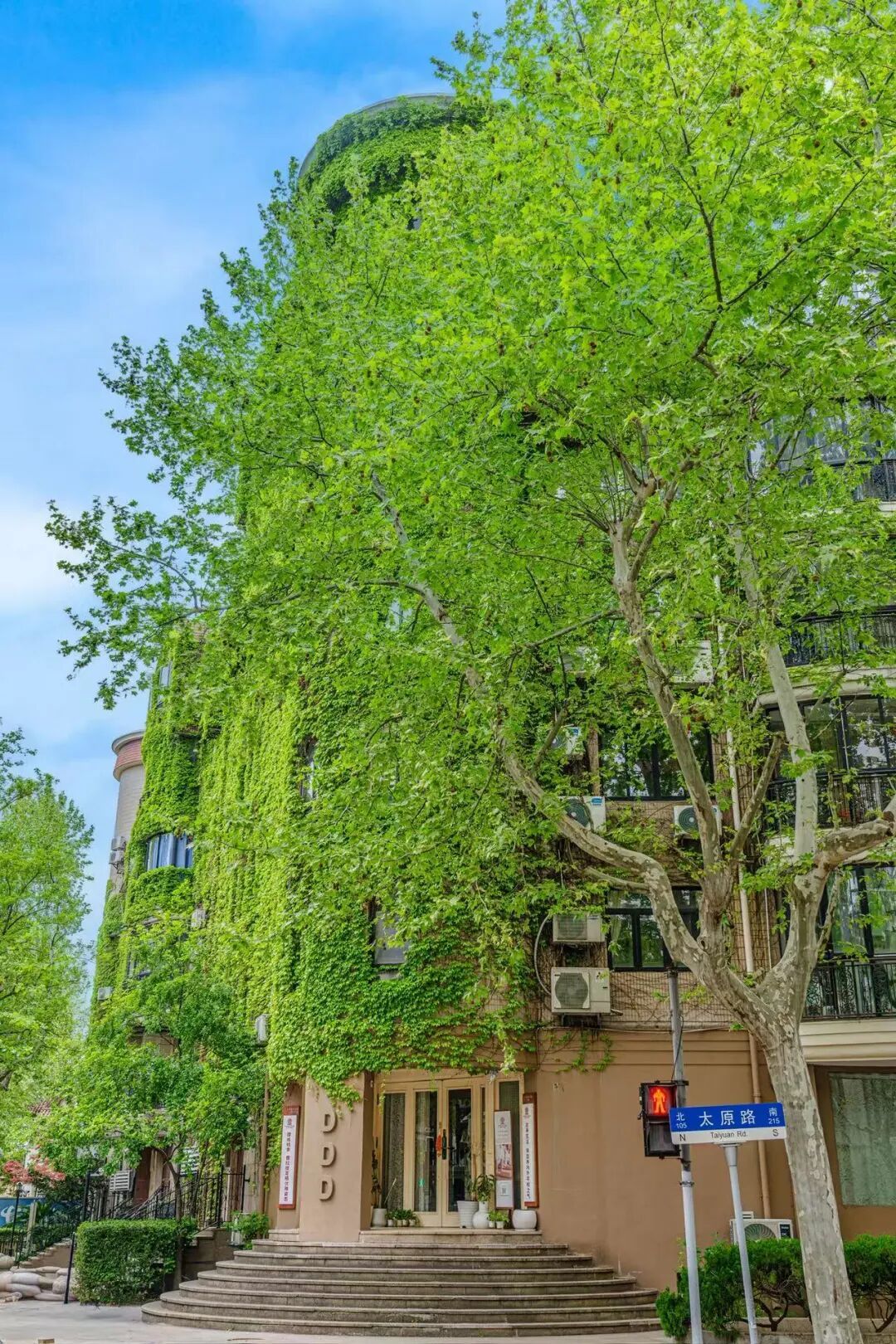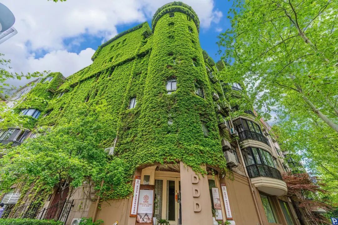 “网绿大楼”坐落于永嘉路425号,地处永嘉路与太原路交汇处,隶属于1995年落成的达汇花园公寓。复古的建筑形态与周边百年历史洋房相邻,新旧交融,别具海派韵味。西侧整面墙体被爬山虎(地锦)全面覆盖,浅米色圆拱窗与婉约的弧形楼梯在叶丛间若隐若现,氛围感十足。春日新叶呈现鲜嫩透亮的绿色,阳光洒落时,叶色层次分明、光影交错,在路口对角即可拍出完整的森系美景,午后光线柔和,拍摄效果最佳。