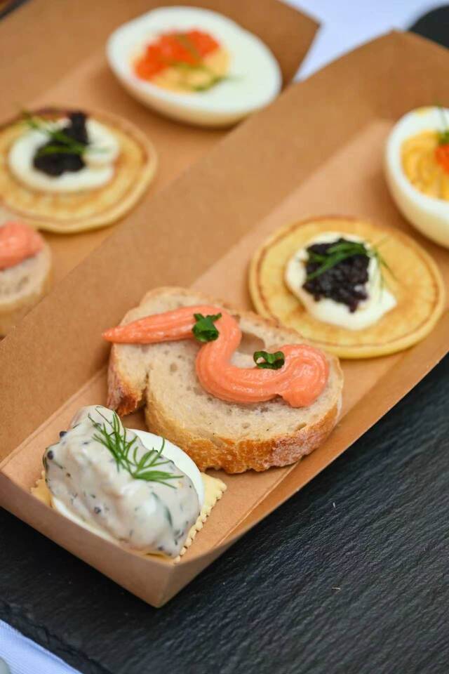 来自北欧的瑞典鱼子酱广受追捧,以新鲜鲳鱼鱼卵为原料,经轻度烟熏锁住本味,搭配特色面包、水煮蛋食用,迸发清冽纯粹的海洋鲜味,30元亲民组合套餐,性价比十足,成为现场热门必尝小食。